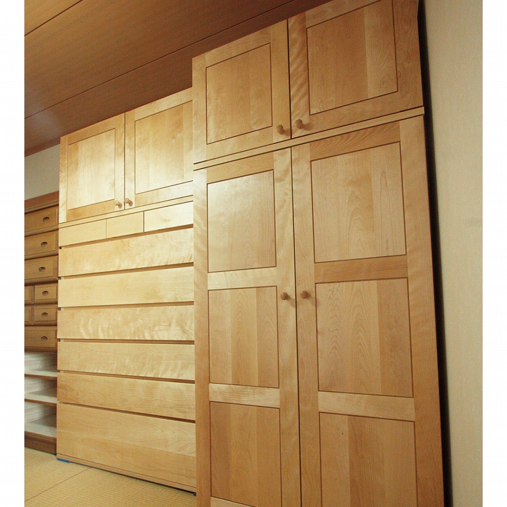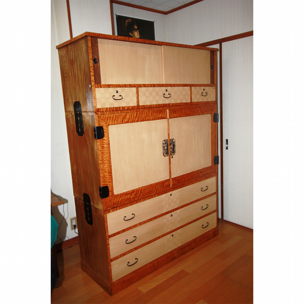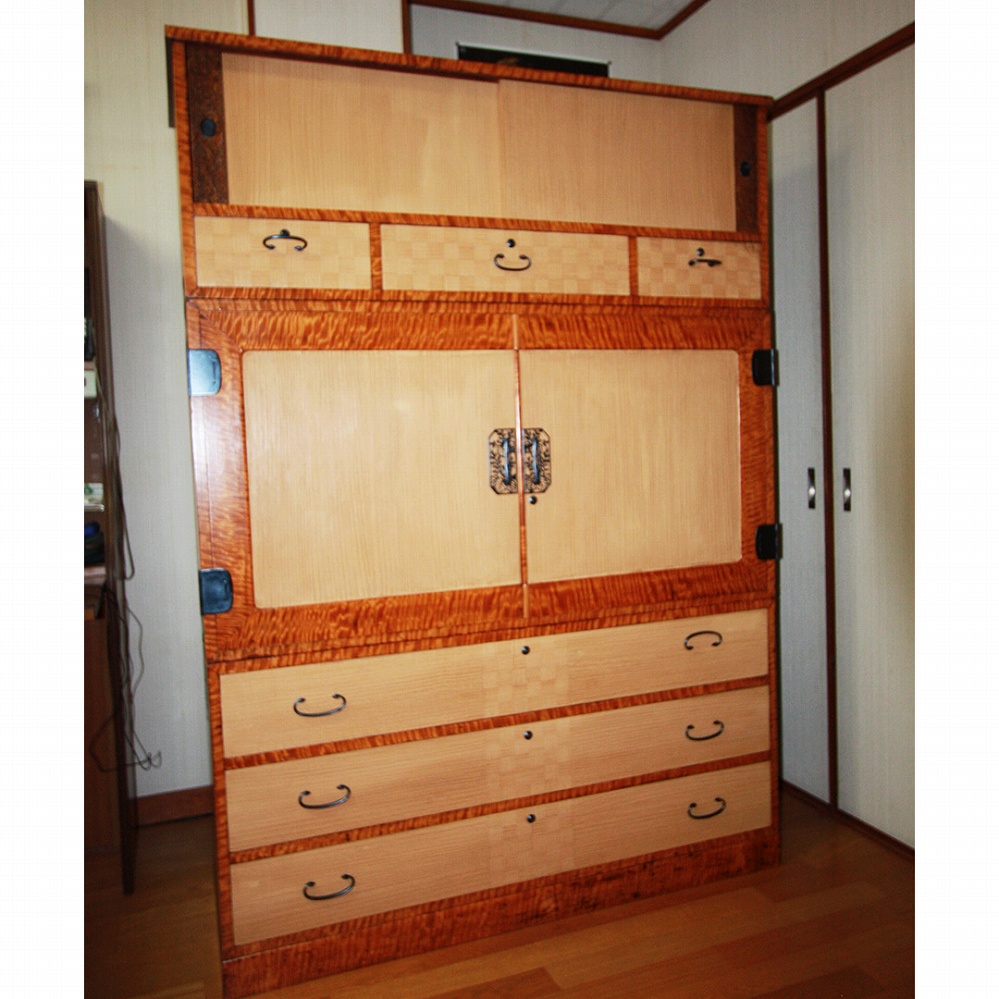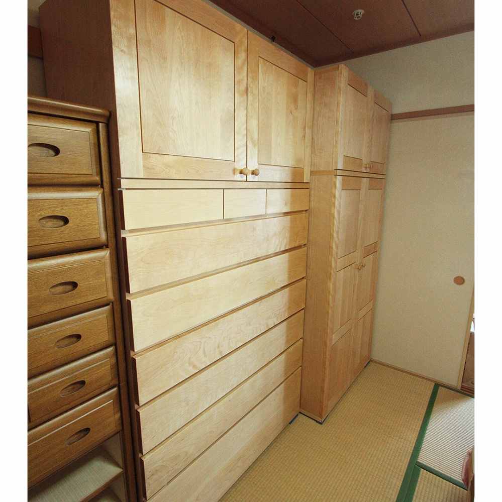 和室にとてもよく似合うカバ桜材の箪笥。明るい印象があります。