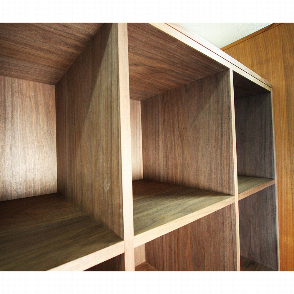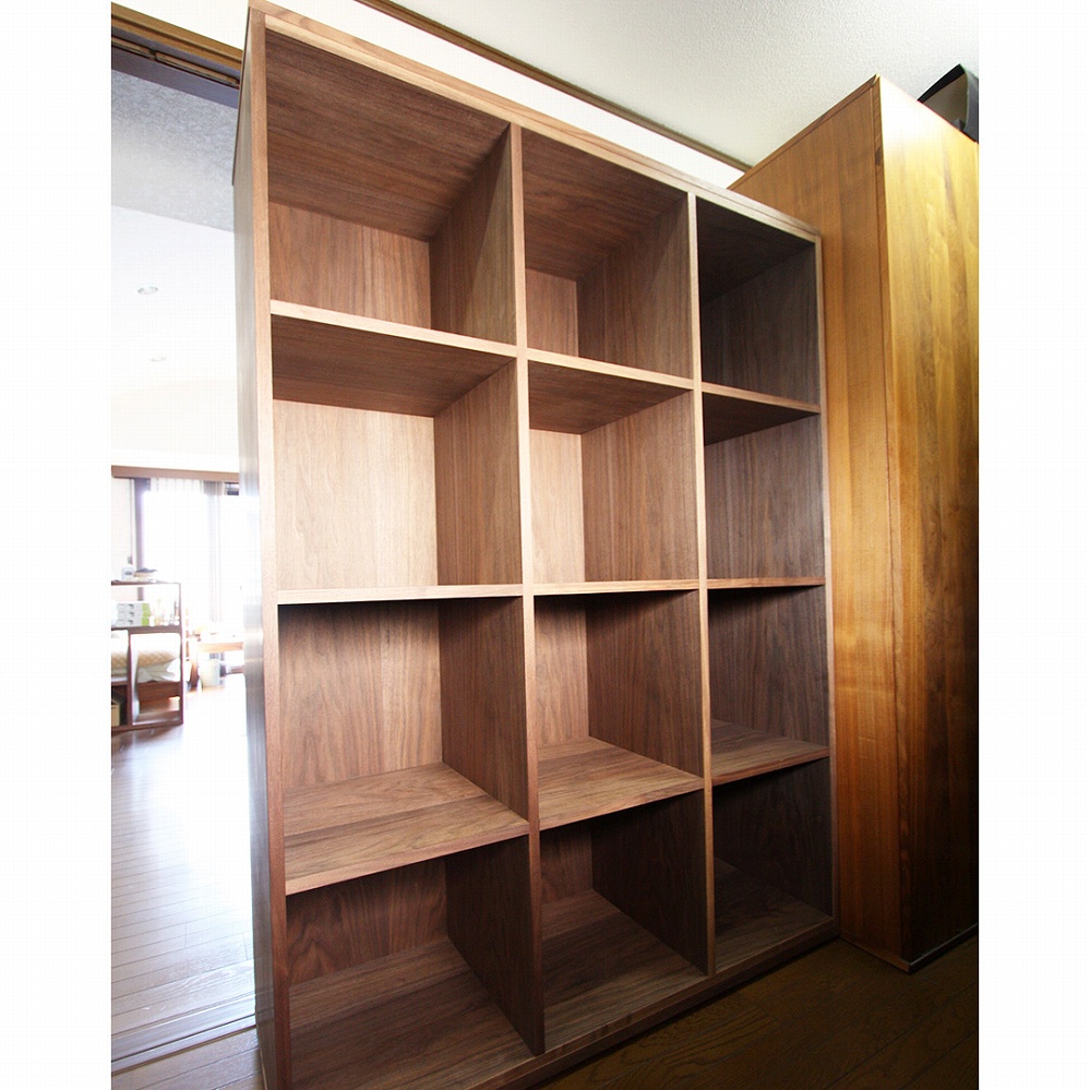 お部屋の一角に開けた空洞に埋め込むようにお作りさせていただいた収納棚です。