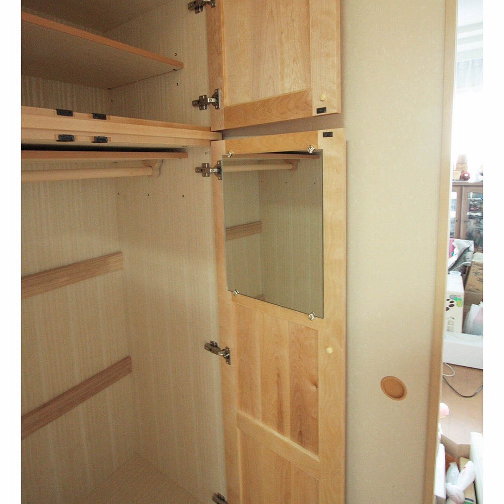 扉内には、小物置きやベルト掛け、ミラー等があります。上部の戸袋にもたっぷり収納できます。