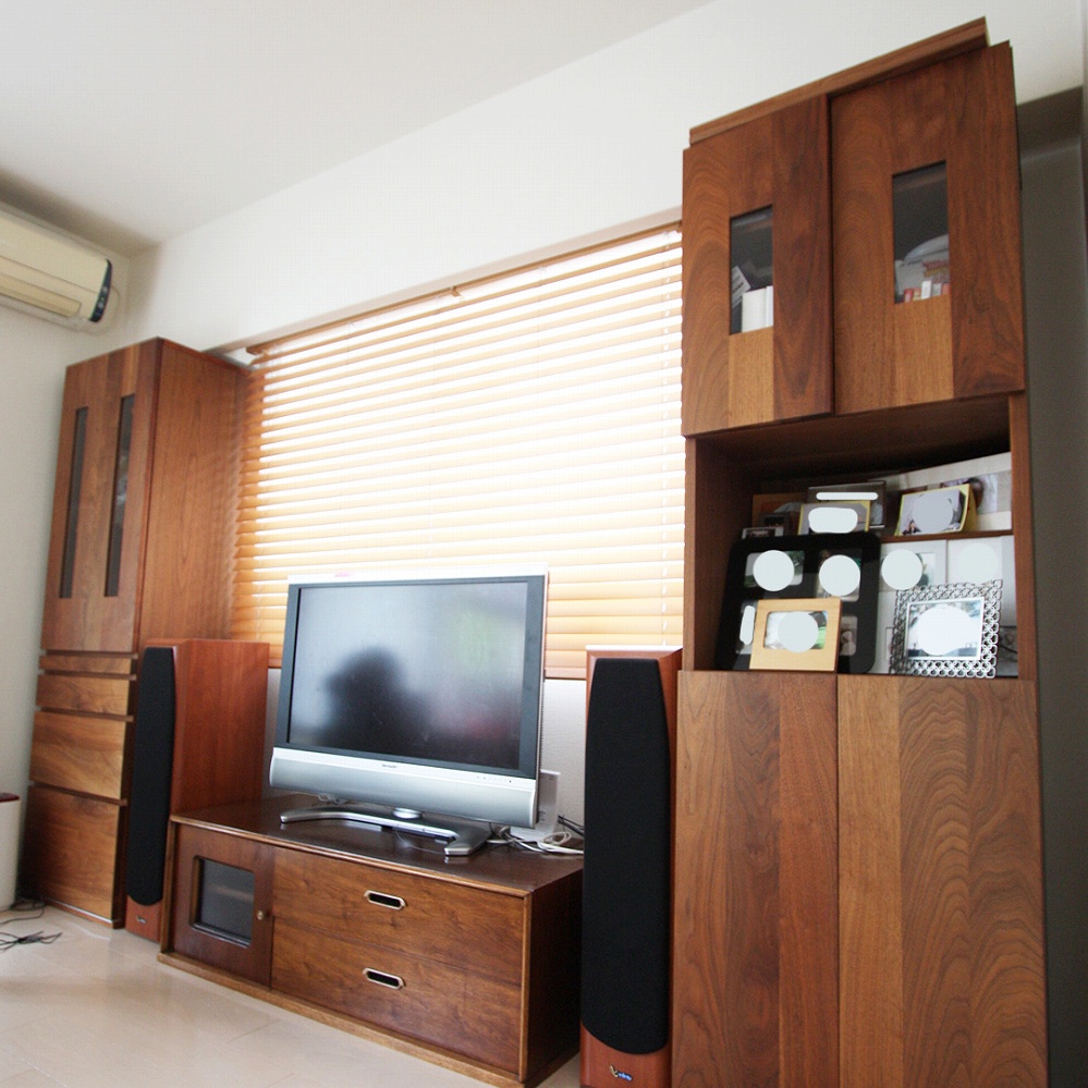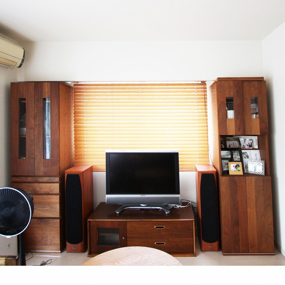 TVボードの両サイドに天然木のブラックウォールナット材でサイドボードをお作りさせていただきました。