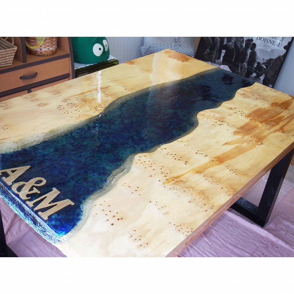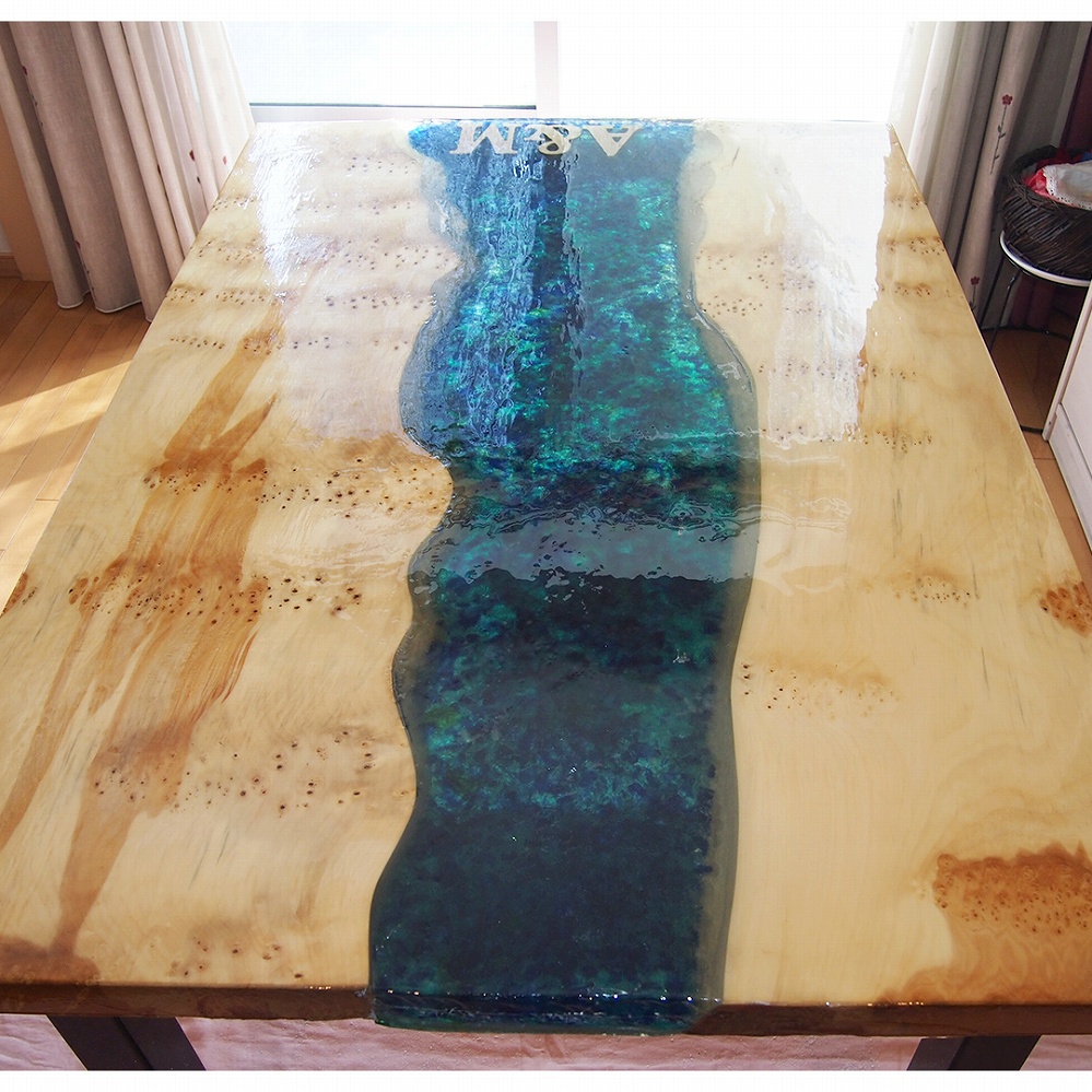 真っ青なレジンで埋めたモダンナチュラルなテーブル天板をお届けさせて頂きました。