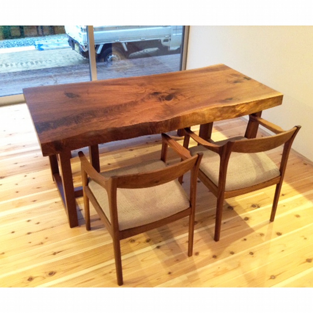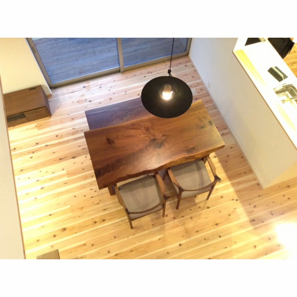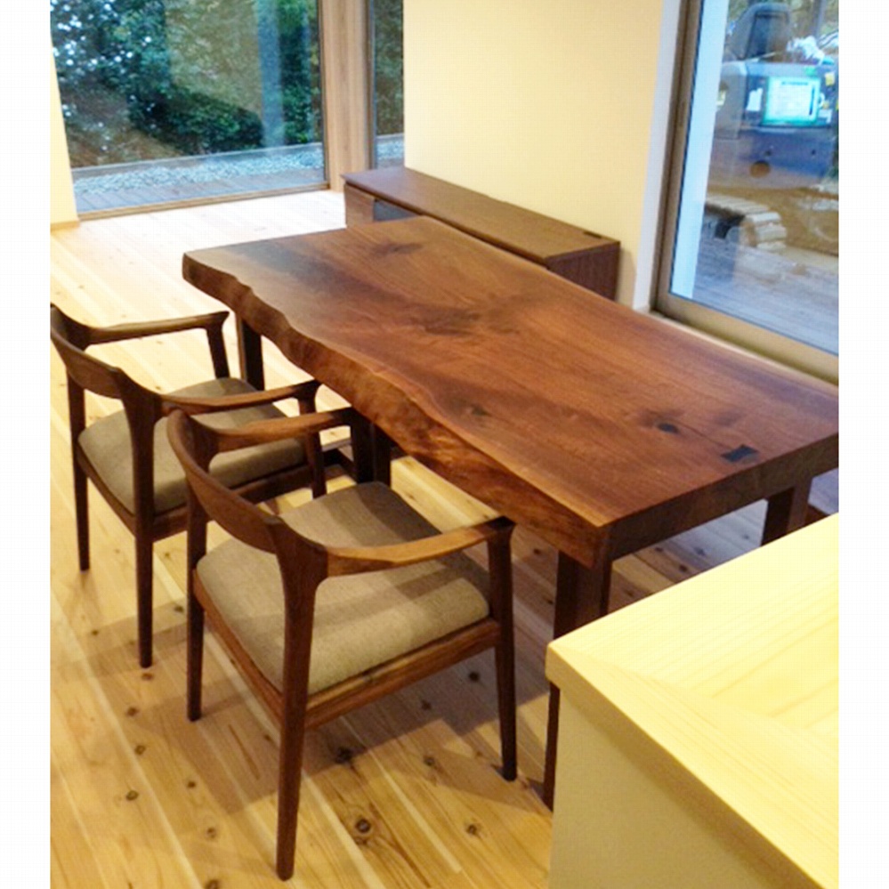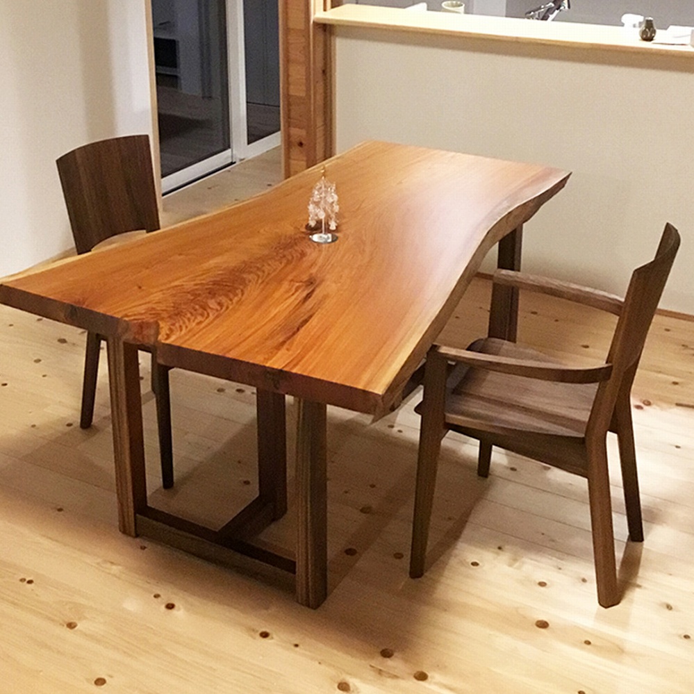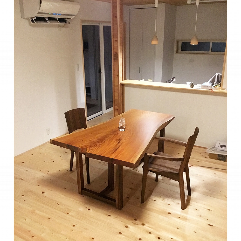 温かみのあるフローリング材に柔らかな表情のウォールナット材の一枚板をお届けさせていただきました。