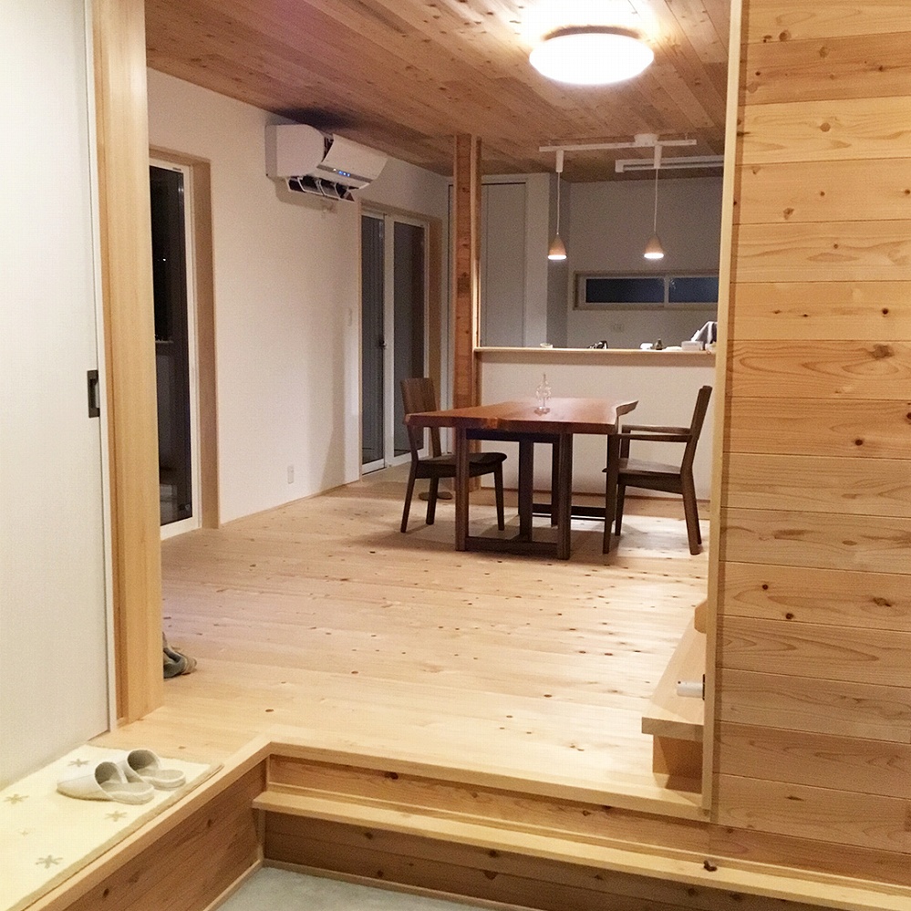 リビング側に見えているのはご一緒にお届けさせていただいているモンキーポッドの輪切りタイプの座卓です。