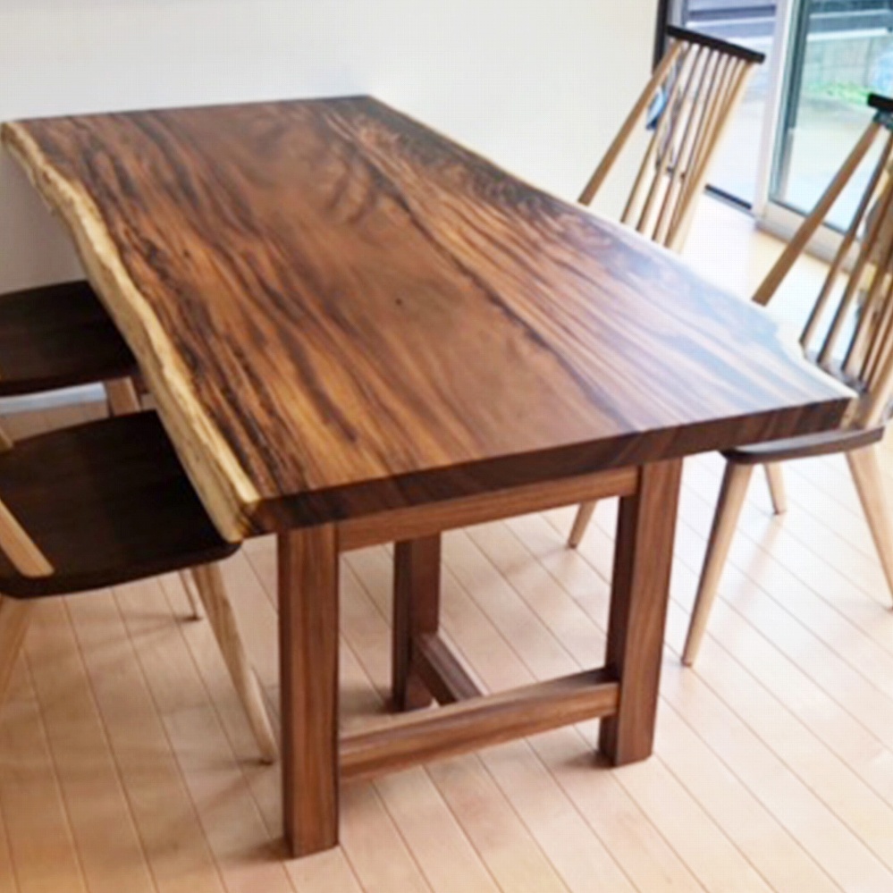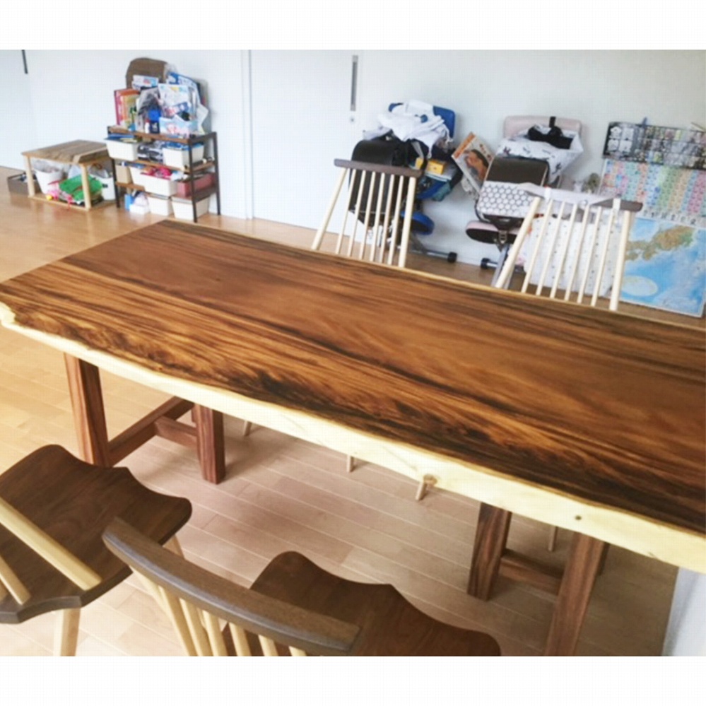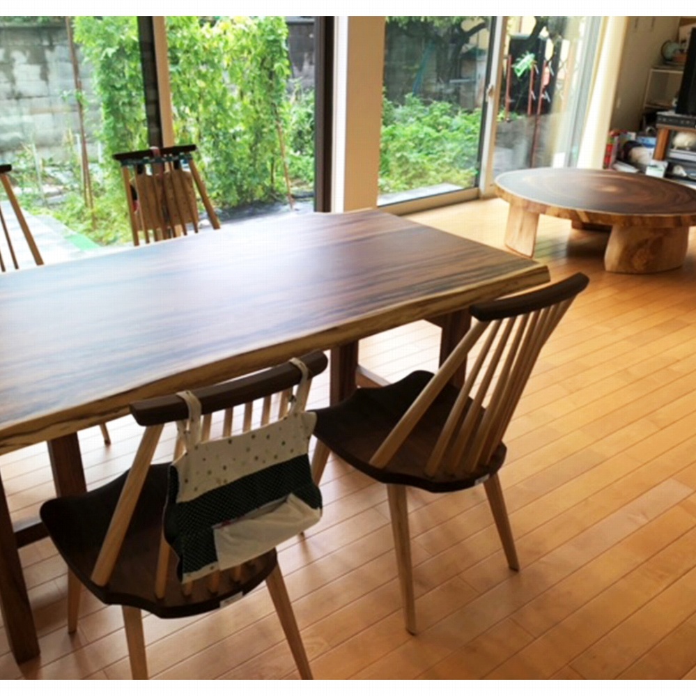 お部屋に馴染む明るいダイニングスペースにモンキーポッド材の一枚板をお届けさせていただきました。