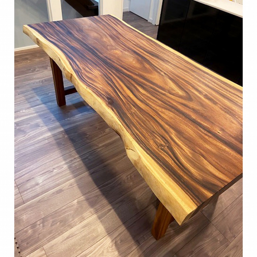 美しい木目と迫力のあるサイズ感で魅了されるモンキーポッドの一枚板をお届けさせていただきました。