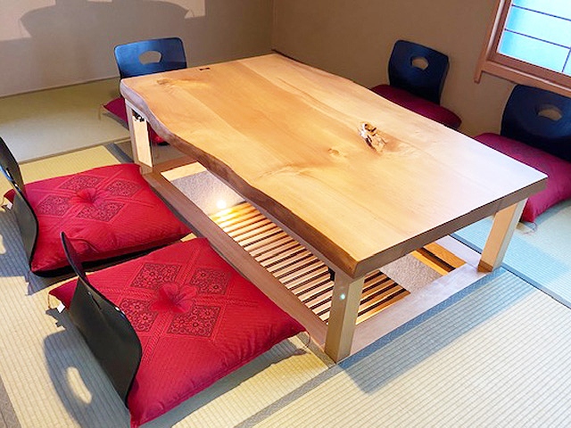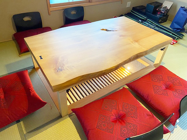 優しい表情の良いイチョウの一枚板をコタツテーブルとしてお届けさせていただきました。