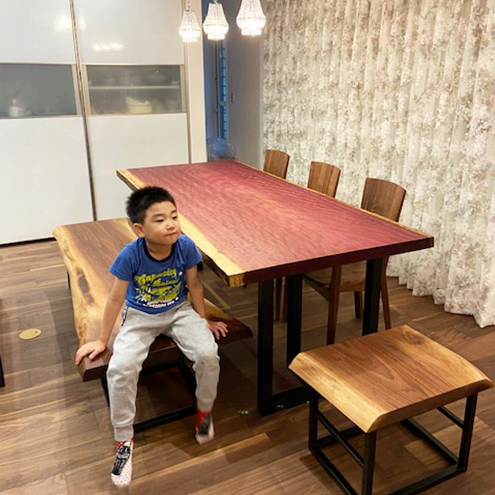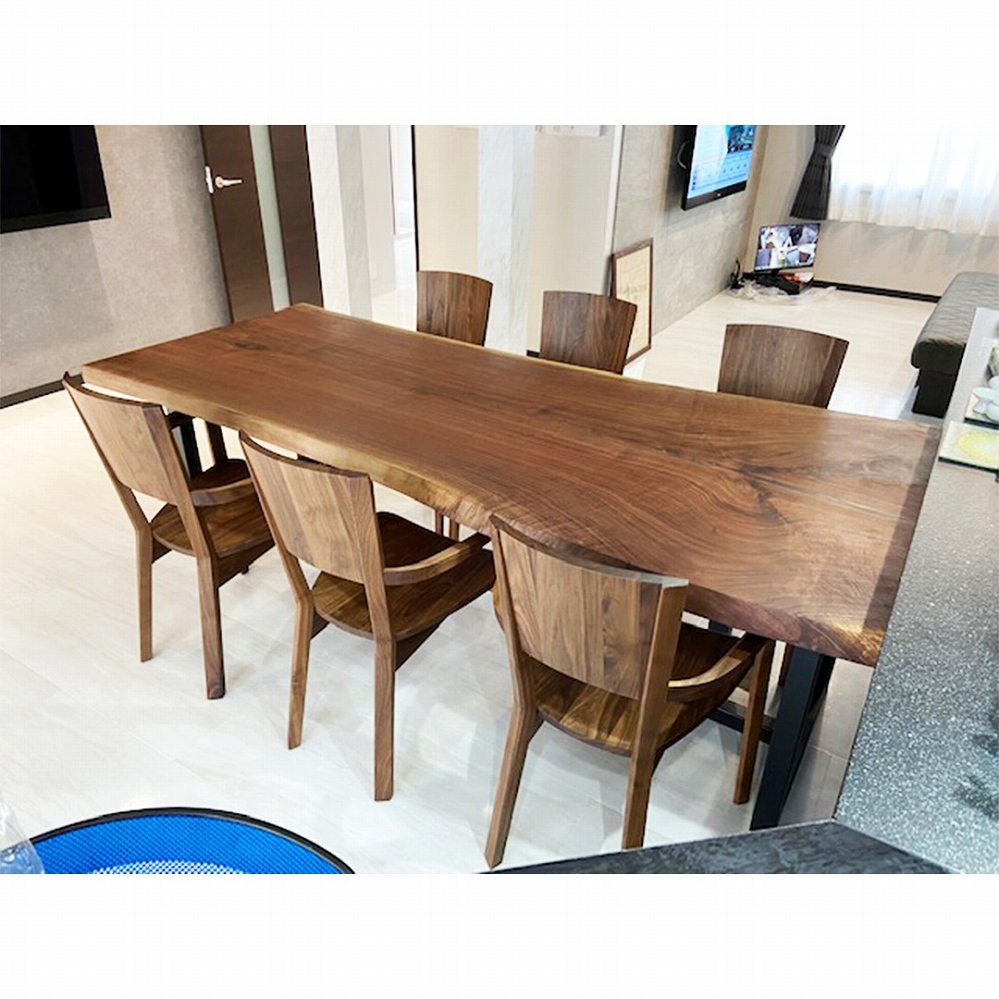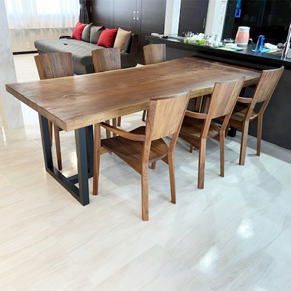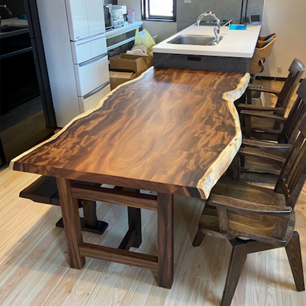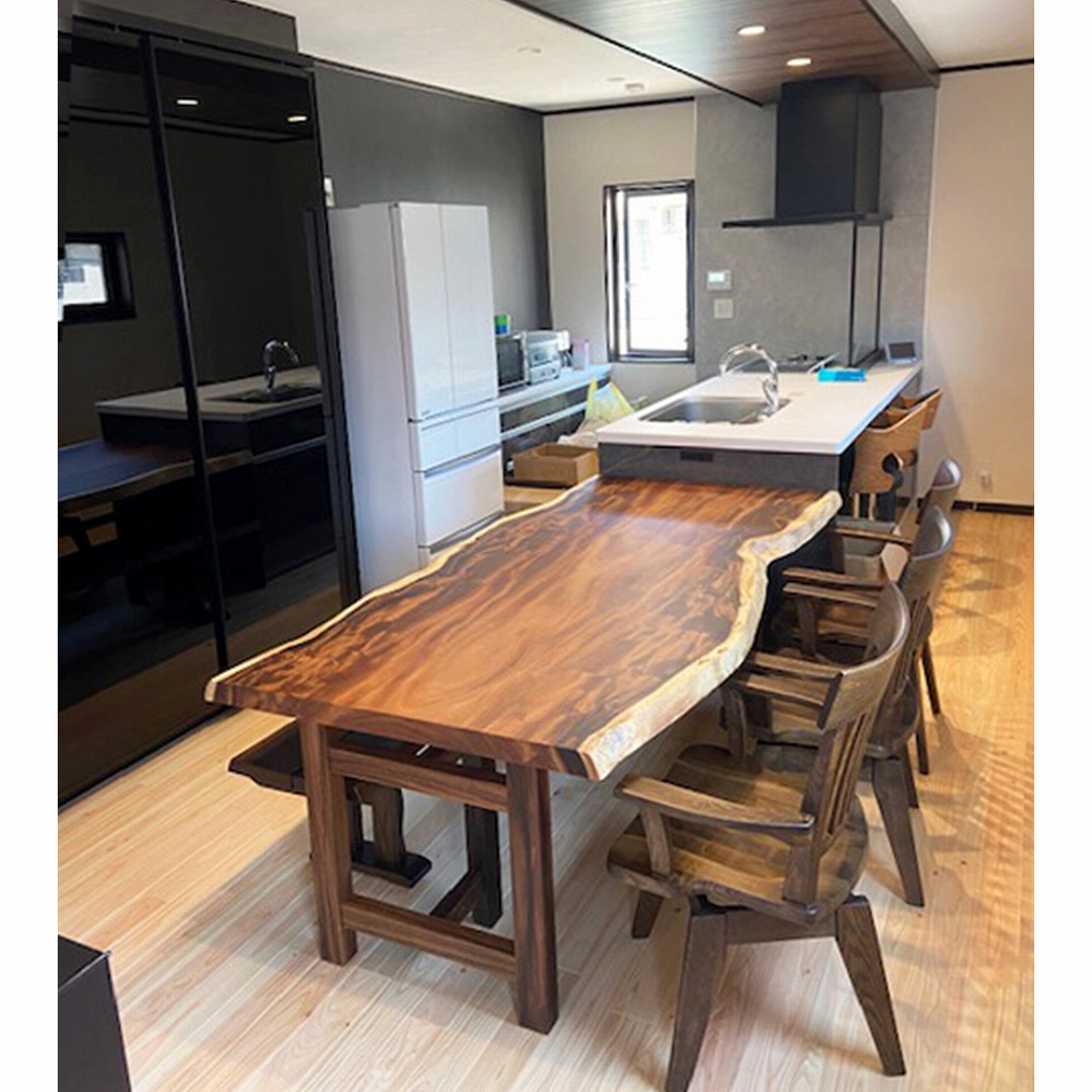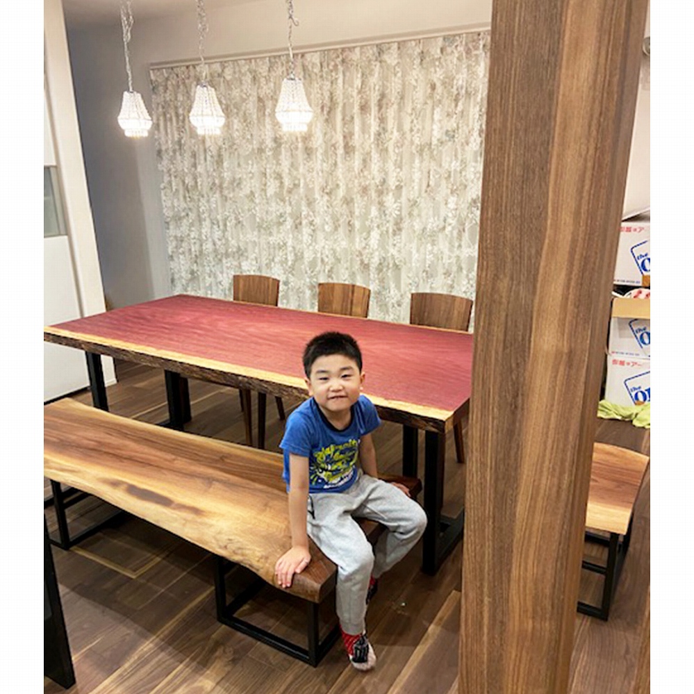 ウォールナット材の一枚板は明るい色合いのフローリングによく映えるおススメの組み合わせです。