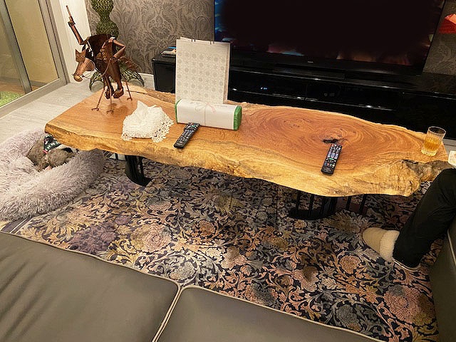 輝くように照るキラキラの杢が特別美しいこの一枚板に毎日癒されてくださいね。
