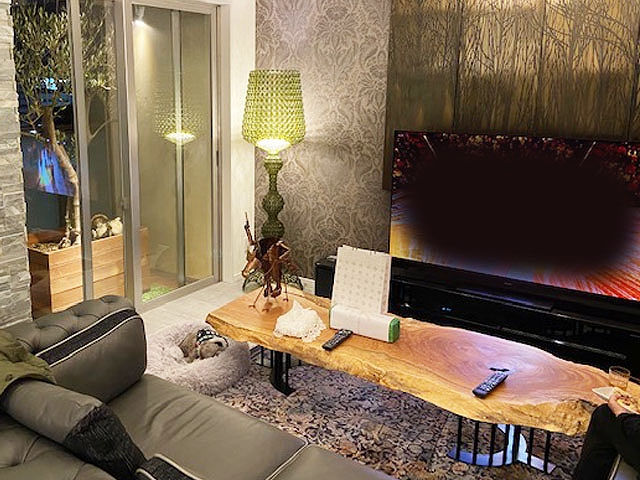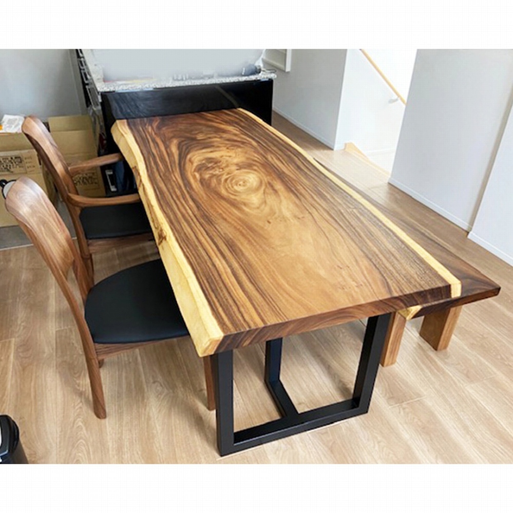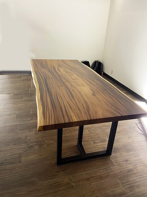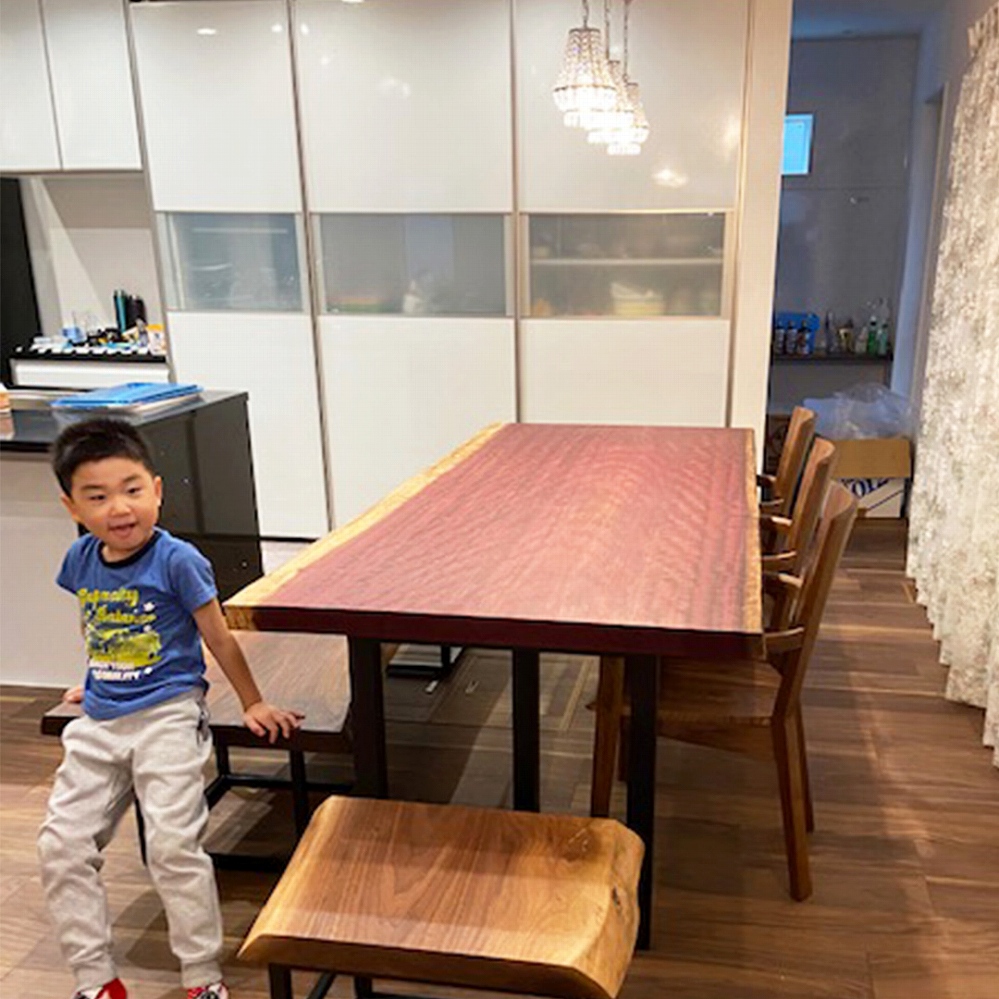 明るい床材の新居によく映えるのモンキーポッドの素敵なテーブルをお届けさせていただきました。