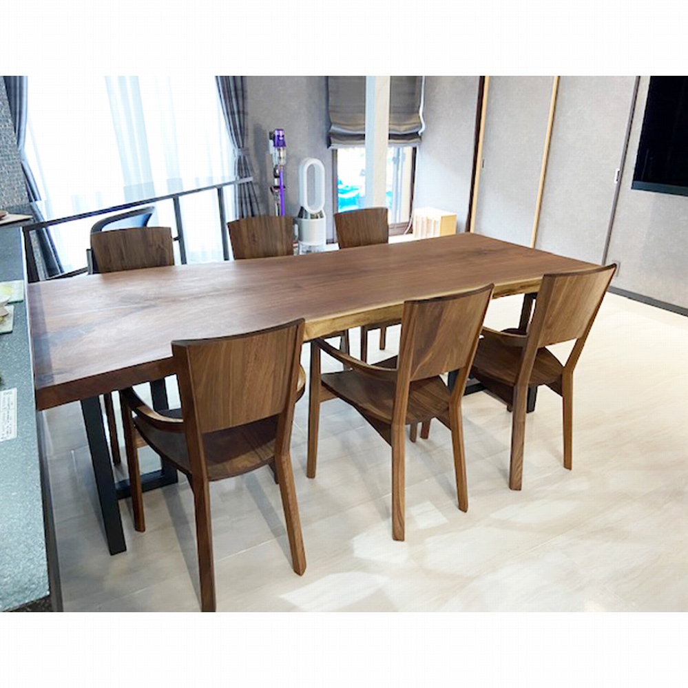 同じウォールナット材のチェアと合わせてすっきりとしたイメージのダイニングセットです。