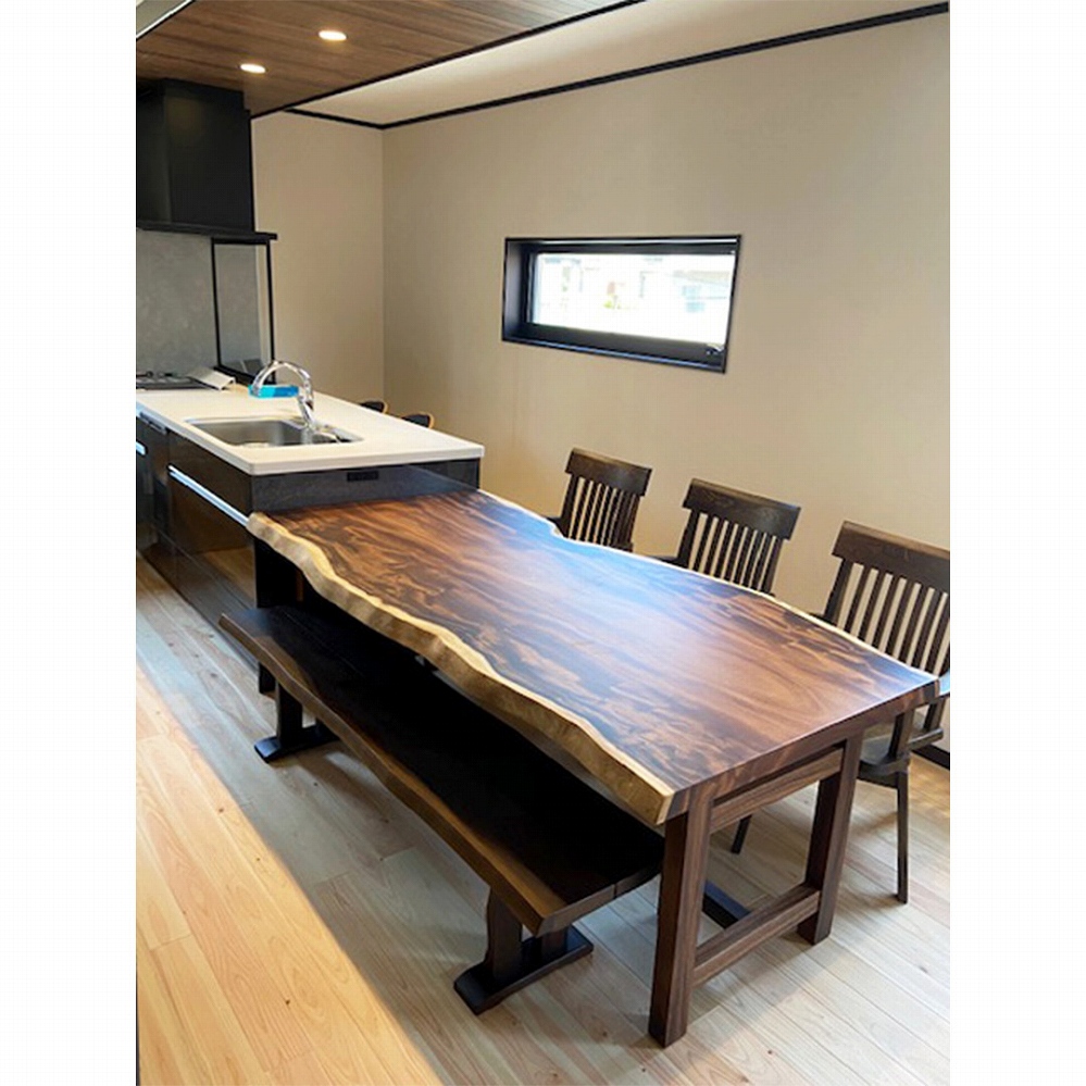 ウォールナット材の一枚板ベンチやイスとの組み合わせも格好いいですね。