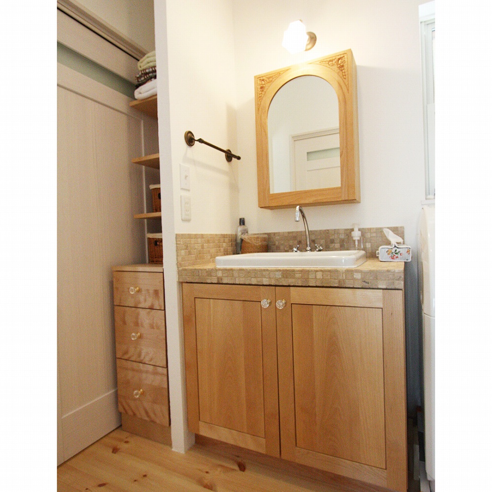 パイン材の温かみを感じる洗面台。