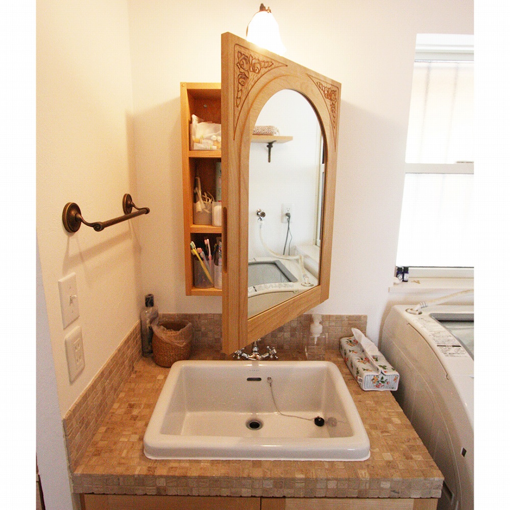 天板には天然のモザイク石を貼ったナチュラルな洗面台です。