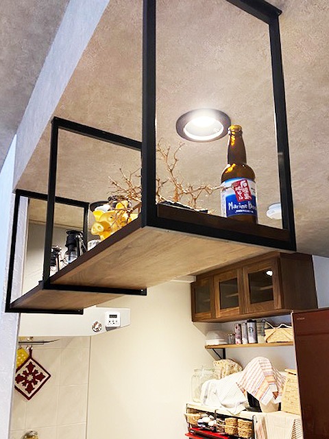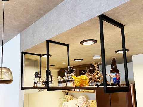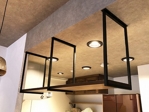 キッチンカウンター上に天井からアイアンを下ろし、インダストリアルな空間の完成です。