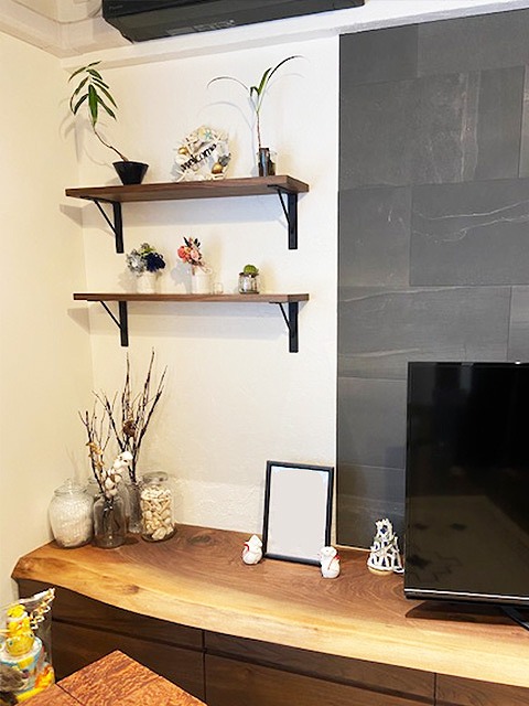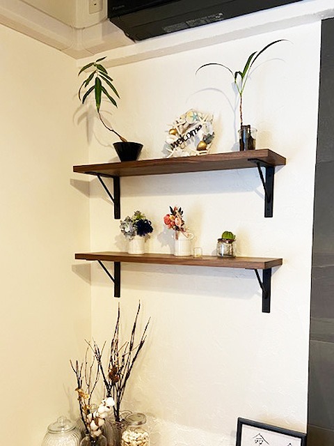 マンションとは思えない、塗り壁塗装に黒のアイアンブラケットが甘さを抑えて良い感じのウォールシェルフ。
