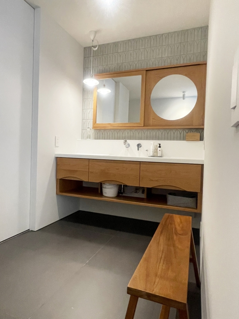 がっつり添え付けるのではなく、吊り扉とウォールシェルフで少しエアリーな空間が完成しました。