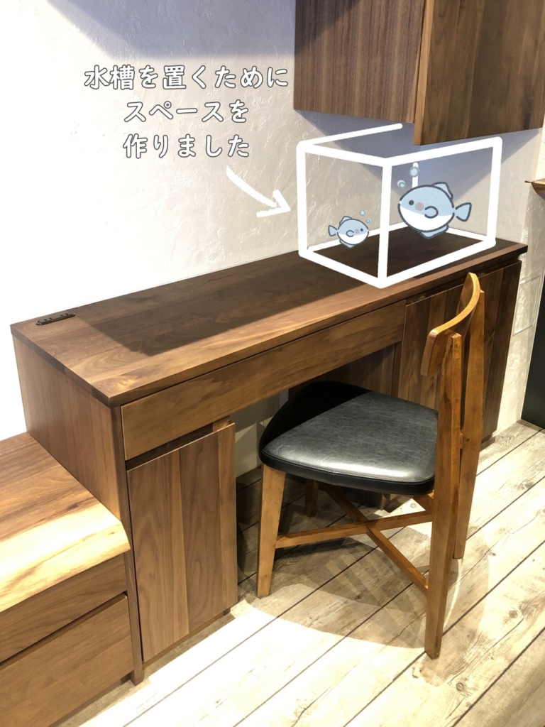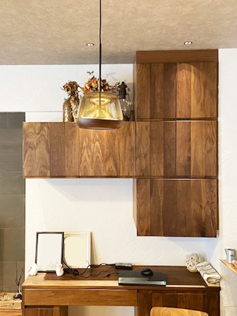 シンプルなダイニングスペースを格好よくウォールナット材の壁面家具で大きくイメージチェンジさせました。ちょうどダイニングテーブルの後ろにくるPCデスクの右端は、観賞用の水槽を設置。上部の吊り戸の底からは照明も取り付けられる空間を設けています。勿論、下台にはエアーポンプも設置可能に作りました。お仕事をしながらも至福のひとときです。