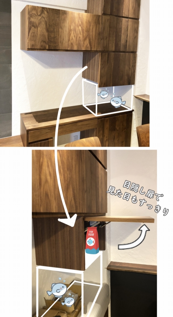 右端の一番下の扉。じつはこちらは収納スペースではなく、水槽の上部をスッキリと綺麗に見せるための隠し扉です。