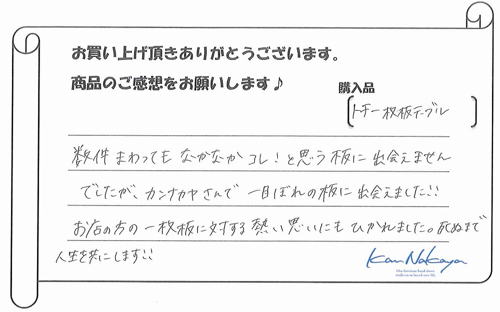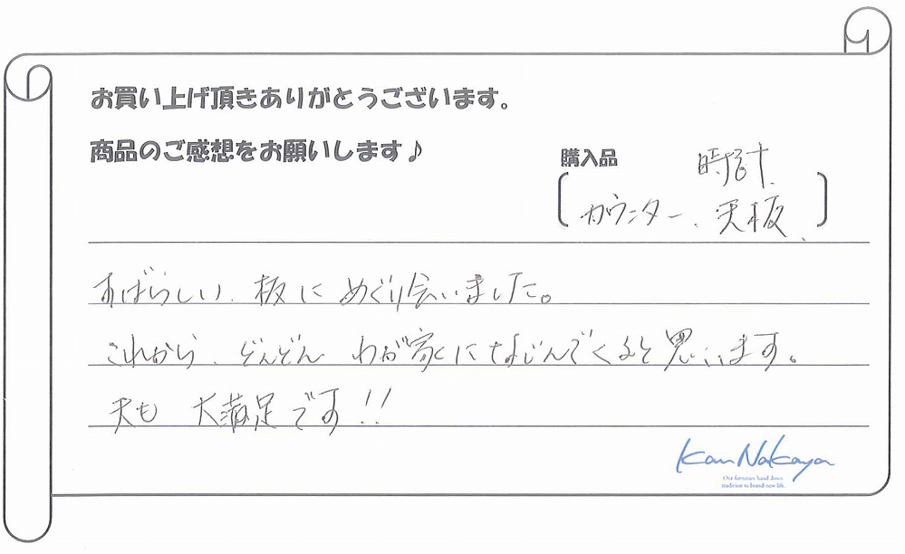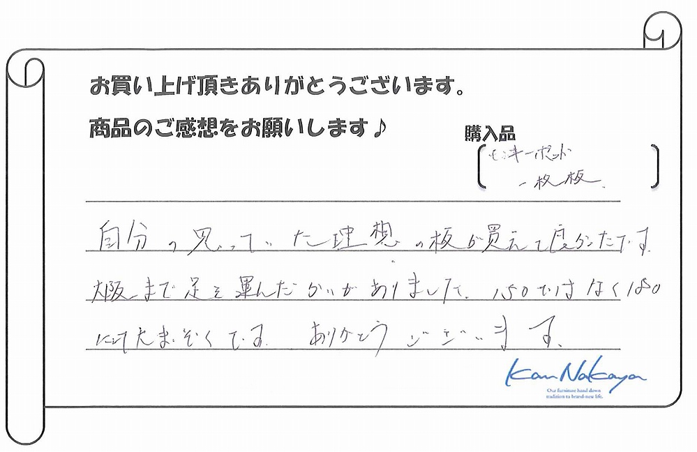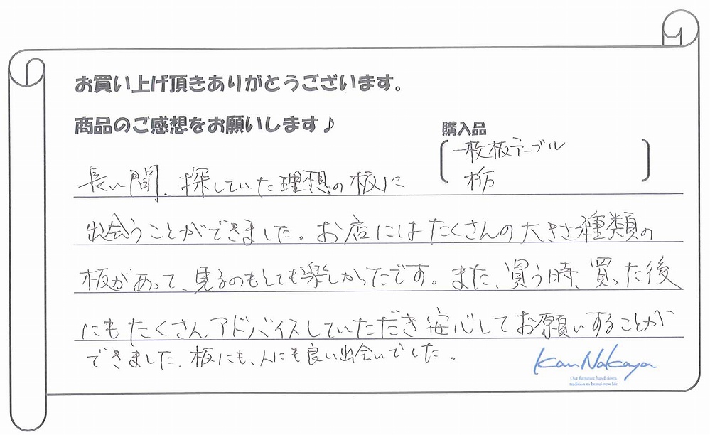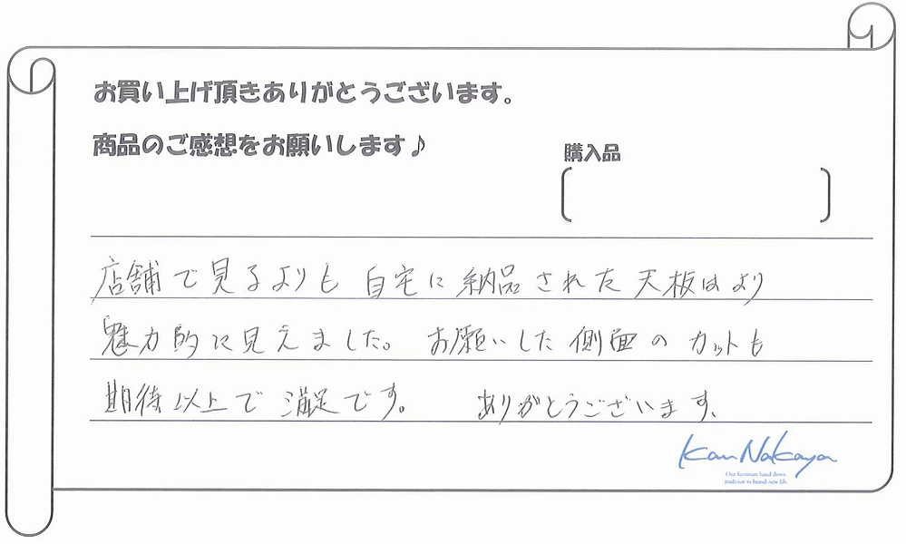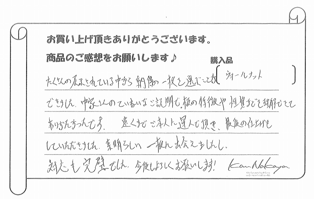 『たくさんの展示されている中から納得の一枚を選ぶことができました。中家さんのていねいなご説明で板の特徴や性質などを理解できてありがたかったです。遠くまでご本人に運んで頂き、最後の仕上げもしていただきました。素晴らしい一枚に出会えましたし、対応も完璧でした。今後もよろしくお願いします!』