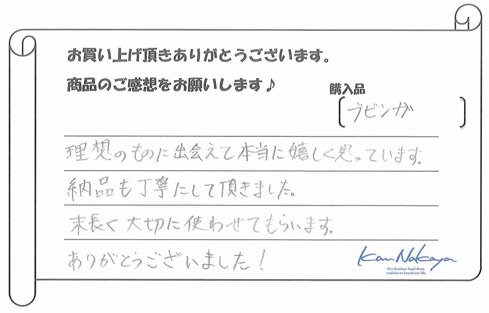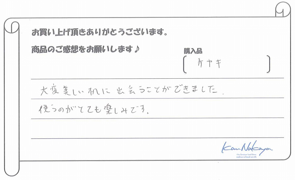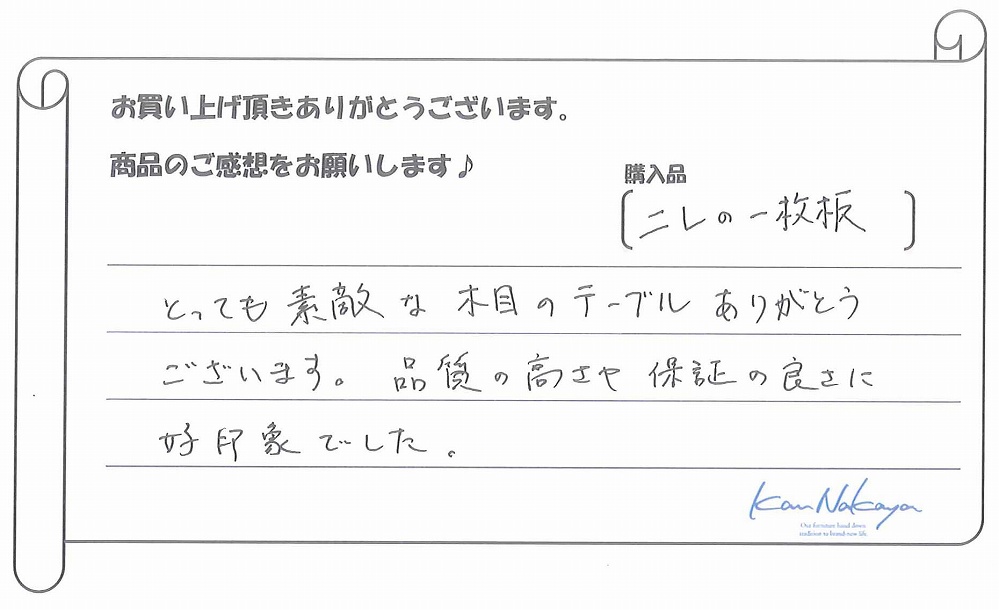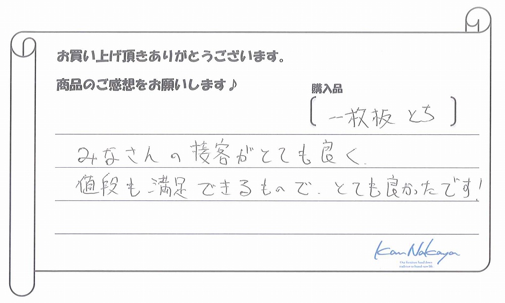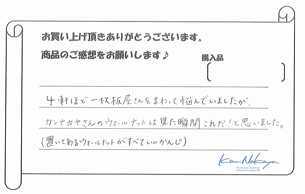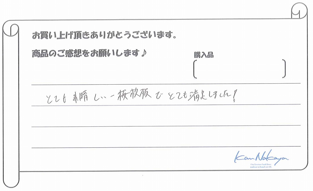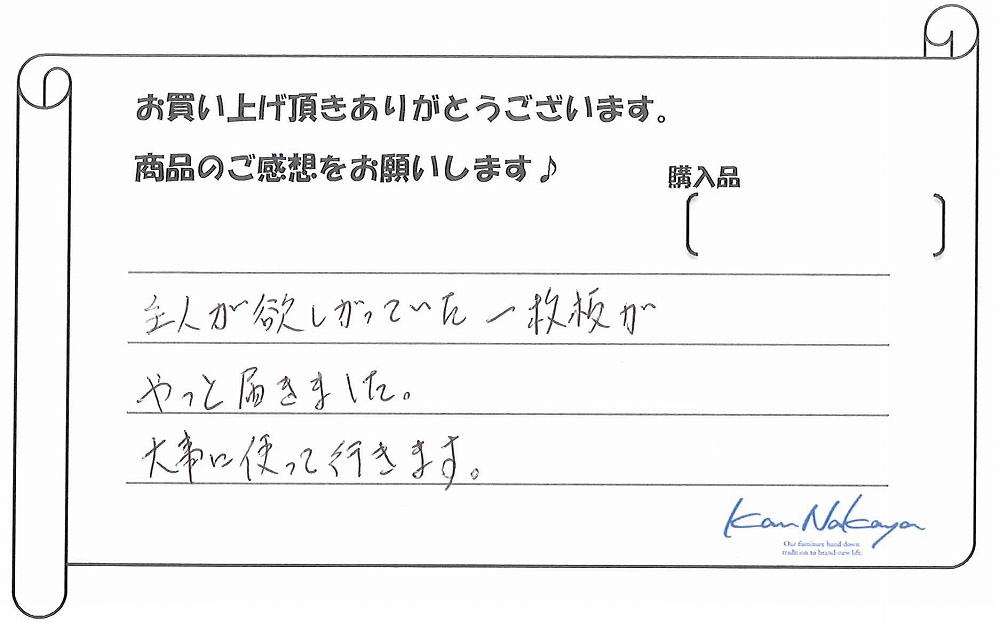 『たくさんの展示されている中から納得の一枚を選ぶことができました。中家さんのていねいなご説明で板の特徴や性質などを理解できてありがたかったです。遠くまでご本人に運んで頂き、最後の仕上げもしていただきました。素晴らしい一枚に出会えましたし、対応も完璧でした。今後もよろしくお願いします!』