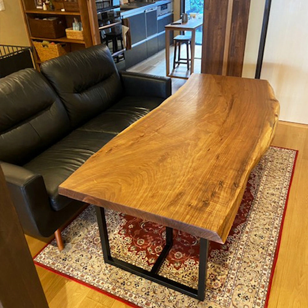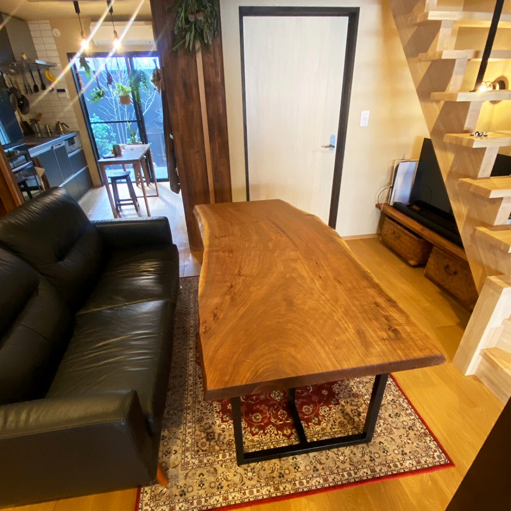 こちらのアイアンの脚を合わせたことで、ウォールナットの一枚板がよりかっこよく引き立っています。