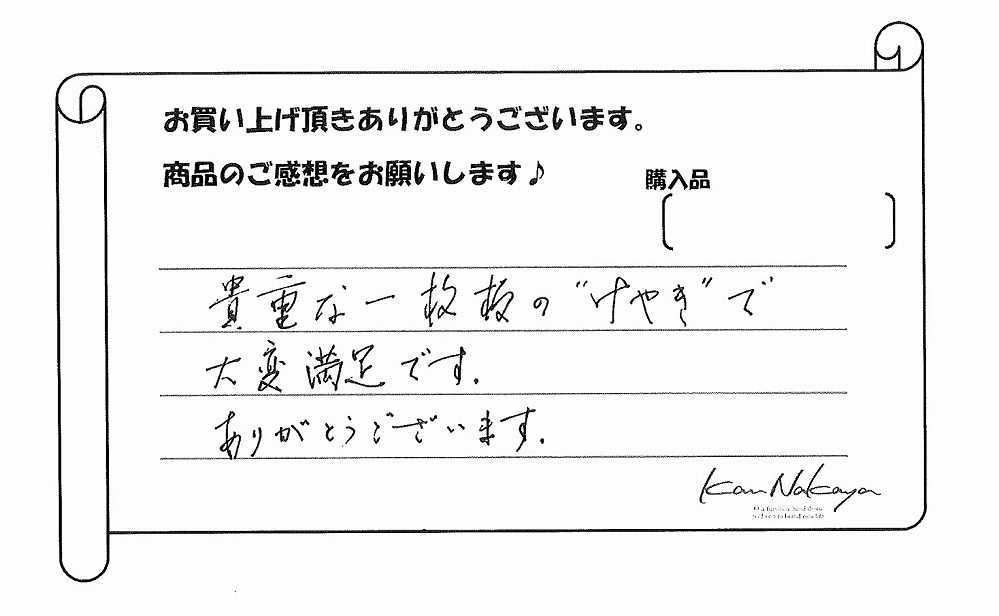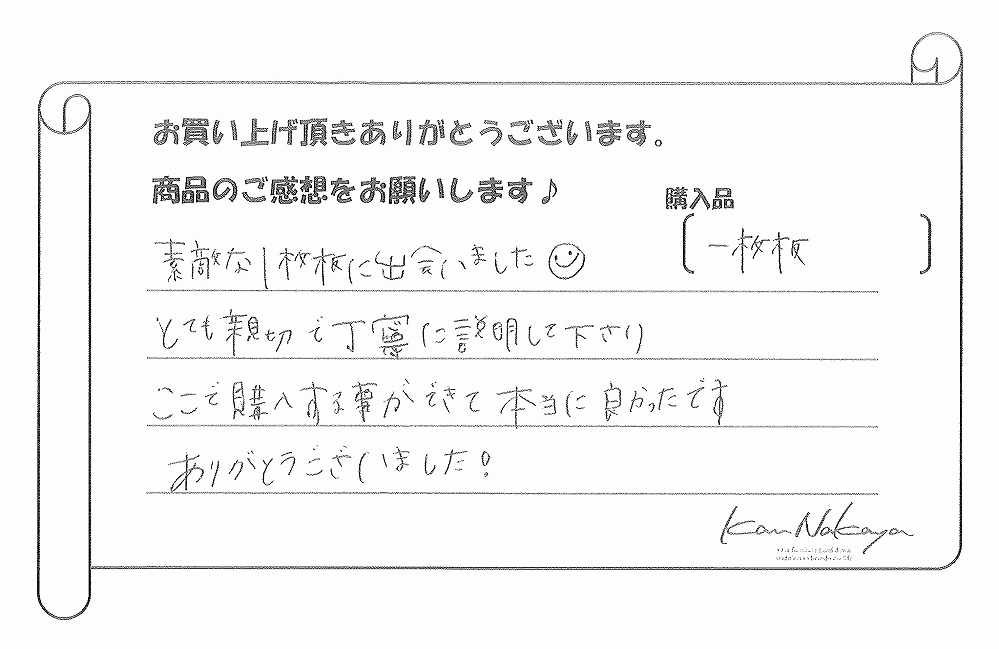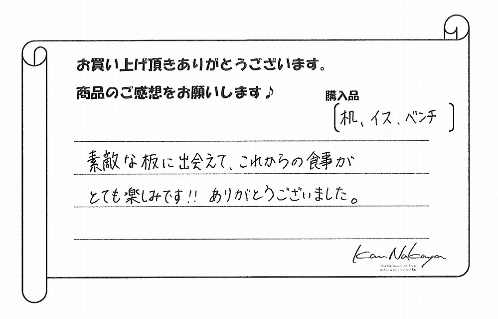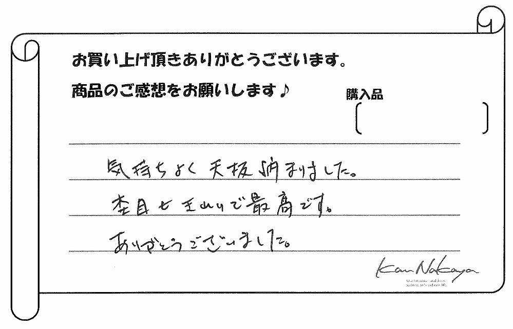 『素敵な板に出会えて、これからの食事がとても楽しみです!!ありがとうございました。』