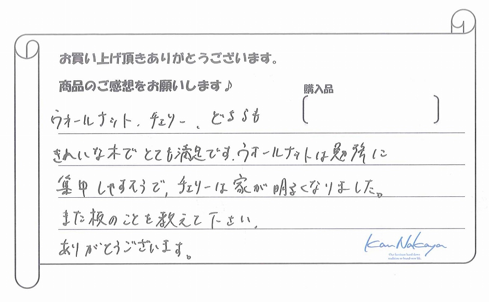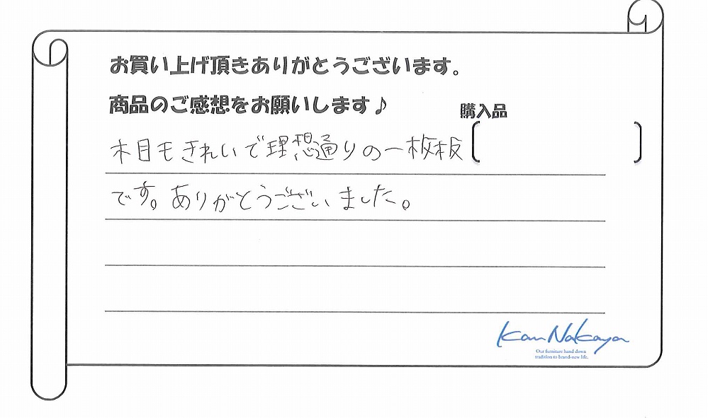綺麗な木目でおすすめの一枚でしたので喜んで頂けて嬉しい限りです。