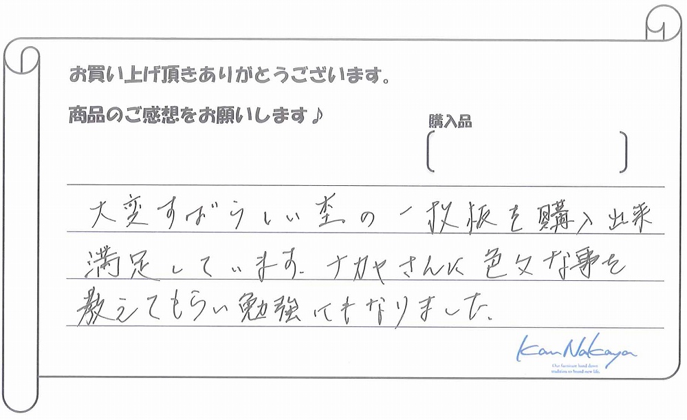 『大変すばらしい杢の一枚板を購入出来満足しています。