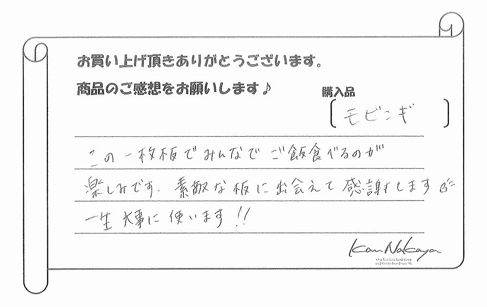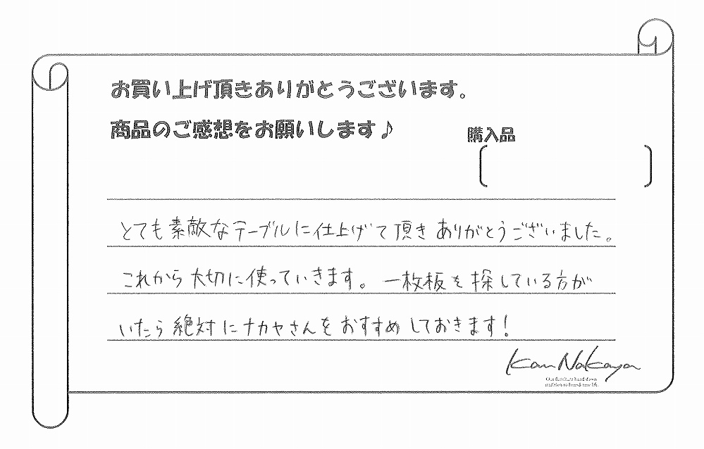 『新居に憧れの一枚板を!!と思い探していました。とても素敵な一枚に出会えて本当に家族みんなで納品を楽しみにしていました。