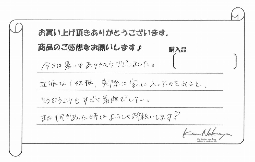 『今日は暑い中ありがとうございました。立派な1枚板、実際に家に入ったのをみると、そうぞうよりもすごく素敵でした。