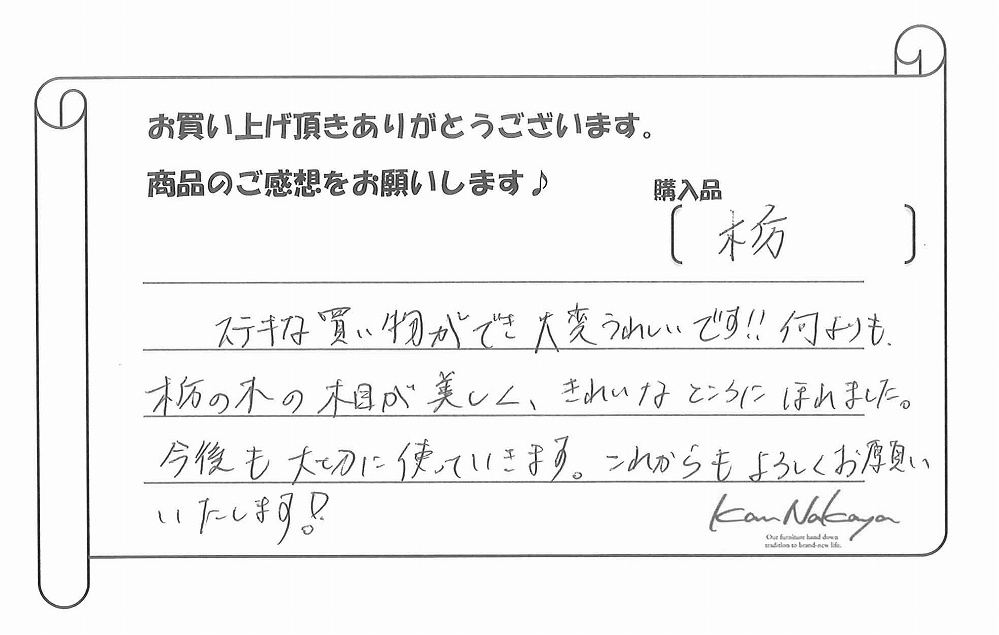 『ステキな買い物ができて大変うれしいです!!何よりも栃の木の木目が美しく、きれいなところにほれました。