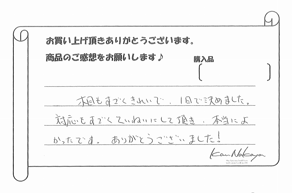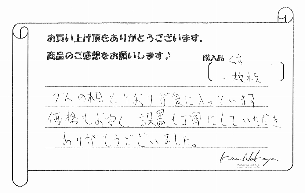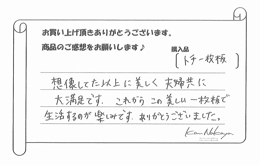 大満足です。 これからこの美しい一枚板で生活するのが楽しみです。ありがとうございました。』