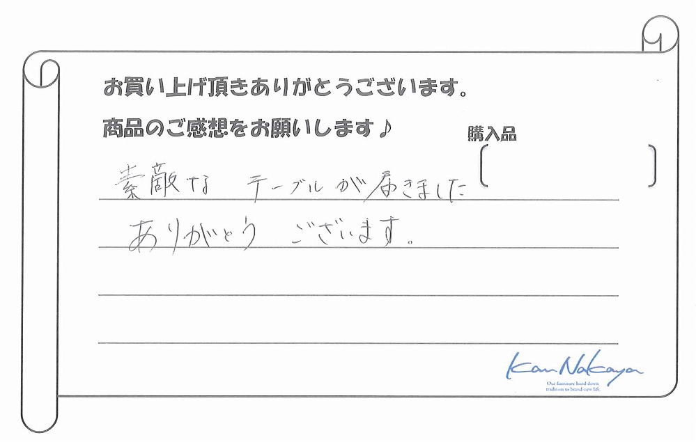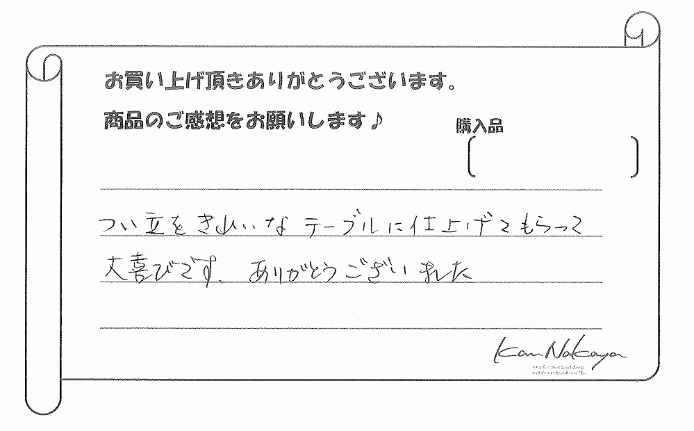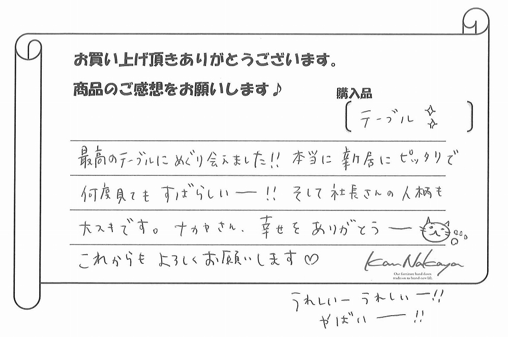 『最高のテーブルにめぐり会えました!!本当に新居にピッタリで何度見てもすばらしいー!!そして社長さんの人柄も大スキです。ナカヤさん、幸せをありがとうー🐱🐾