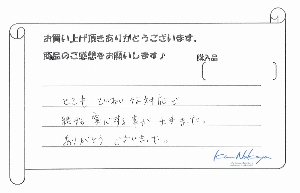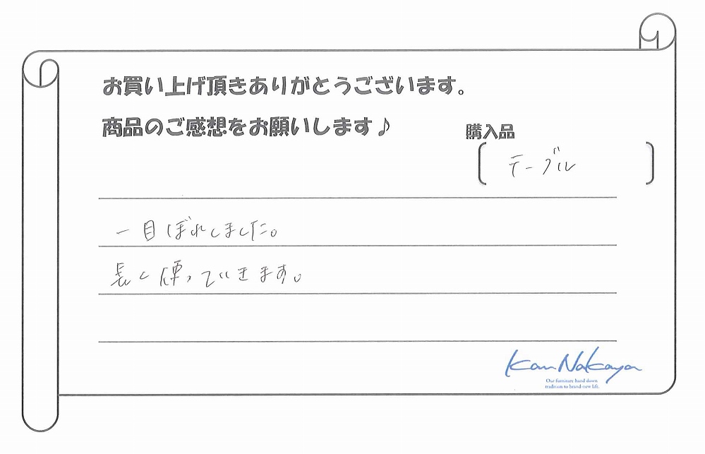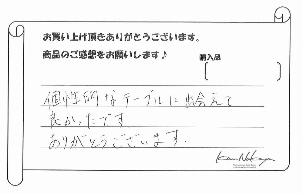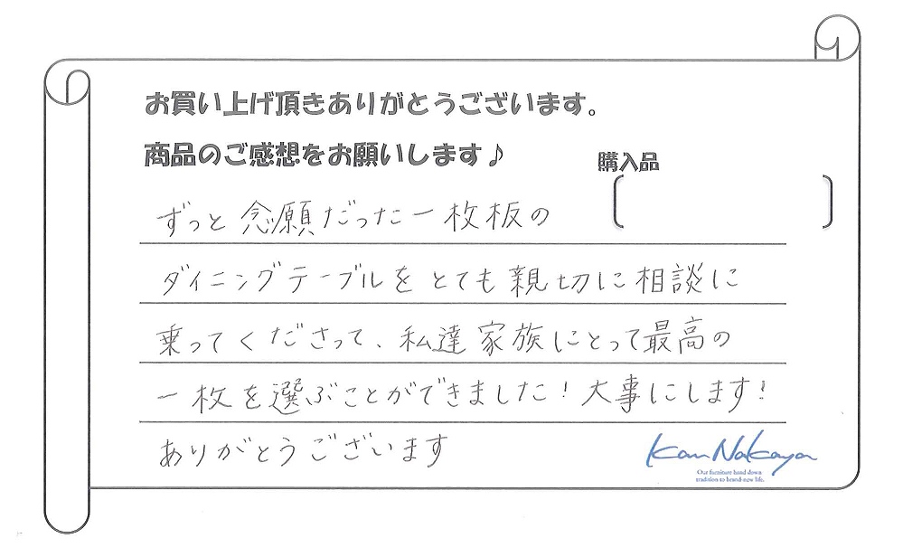 『ずっと念願だった一枚板のダイニングテーブルをとても親切に相談に乗ってくださって、私達家族にとって最高の一枚を選ぶことができました!大事にします!
