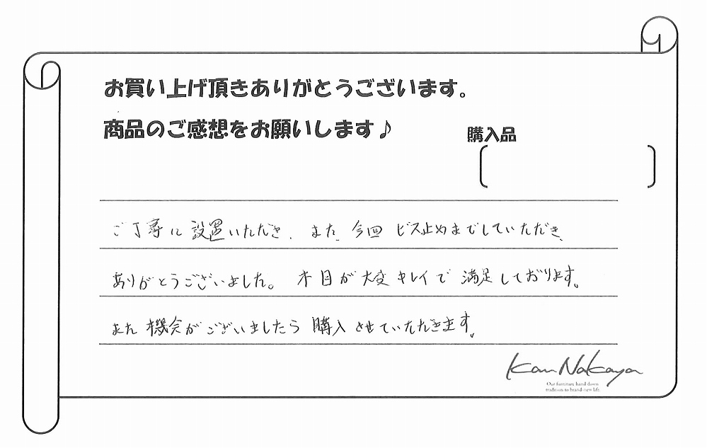『ご丁寧に設置いただき、また、今回ビス止めまでしていただきありがとうございました。木目が大変キレイで満足しております。