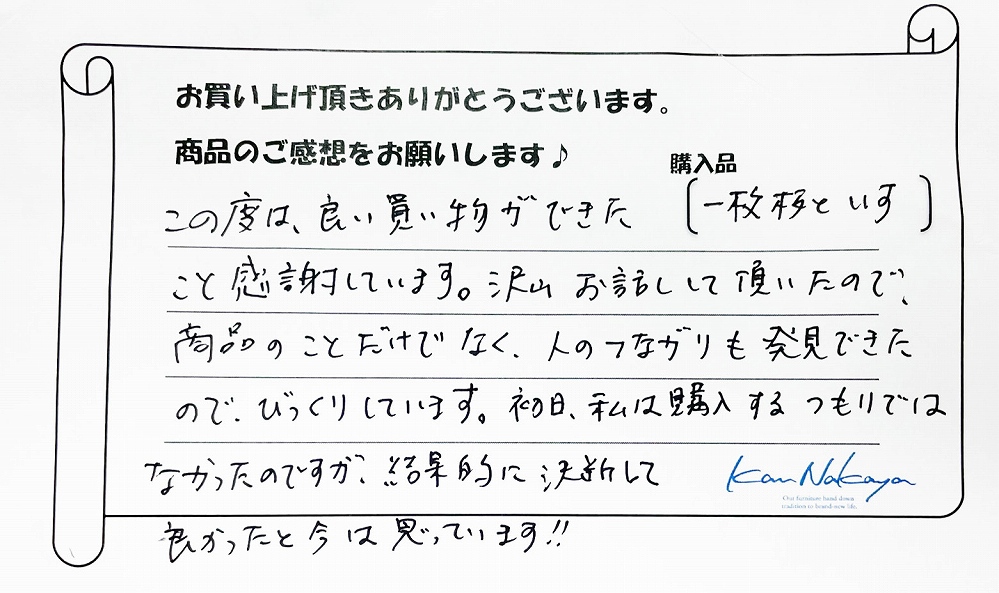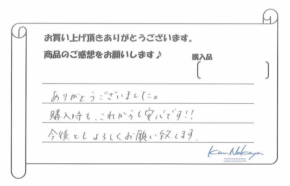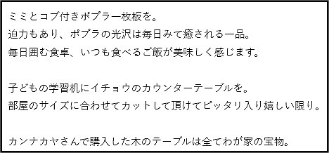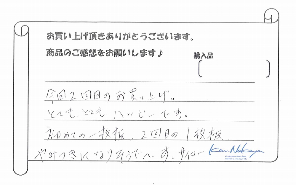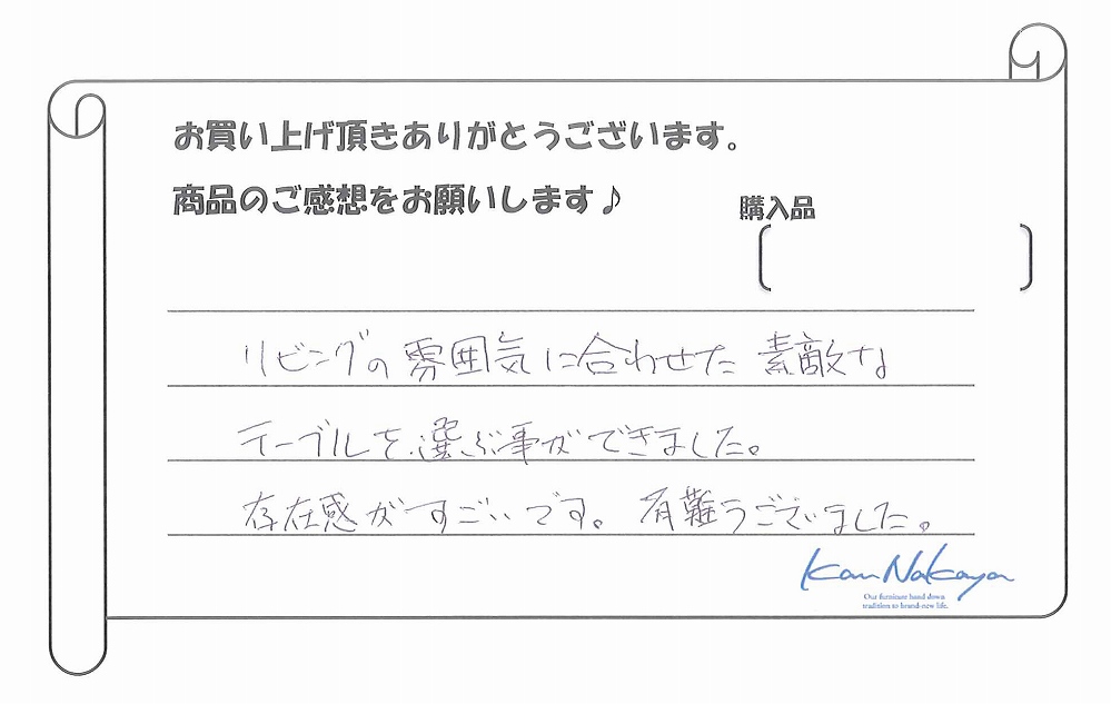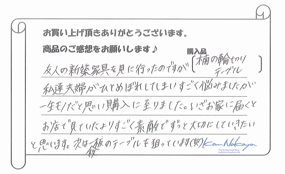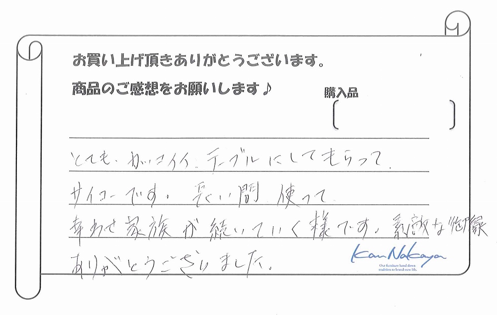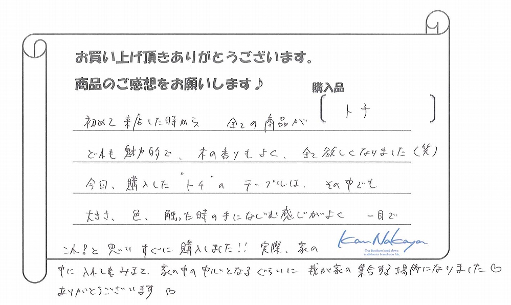 『初めて来店した時から、全ての商品がどれも魅力的で、木の香りもよく、全て欲しくなりました(笑)今回購入した“トチ”のテーブルは、その中でも大きさ、色、触った時の手になじむ感じがよく、一目でこれ!と思いすぐに購入しました!! 実際、家の中に入れてみると、家の中の中心となるぐらいにわが家の集合する場所になりました。ありがとうございます。』