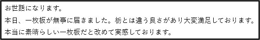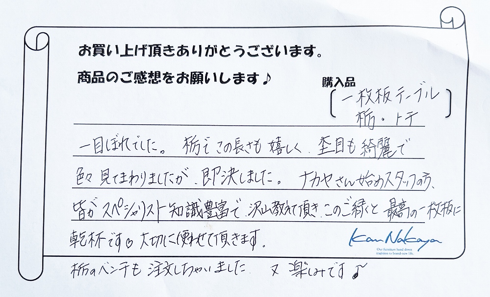 『一目ぼれでした。栃でこの長さも嬉しく、杢目も綺麗で色々見てまわりましたが、即決しました。ナカヤさん始めスタッフの方、皆がスペシャリスト知識豊富で、沢山教えて頂き、このご縁と最高の一枚板に乾杯です!大切に使わせて頂きます。栃のベンチも注文しちゃいました。又楽しみです♪』