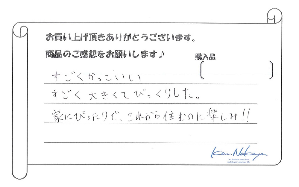 『友人の新築家具を見に行ったのですが私たち夫婦がひとめぼれしてしまいすごく悩みましたが一生モノだと思い購入に至りました。いざお家に届くとお店で見ていたよりすごく素敵でずっと大切にしていきたい