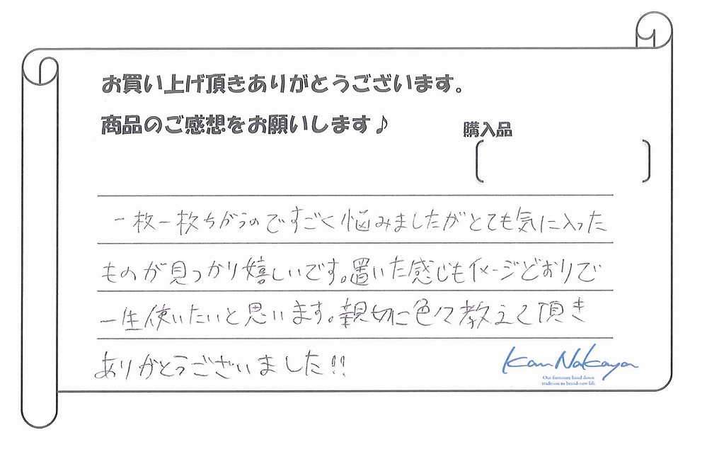 『一枚一枚ちがうのですごく悩みましたがとても気に入ったものが見つかり嬉しいです。置いた感じもイメージどおりで一生使いたいと思います。親切に色々教えて頂きありがとうございました!!』