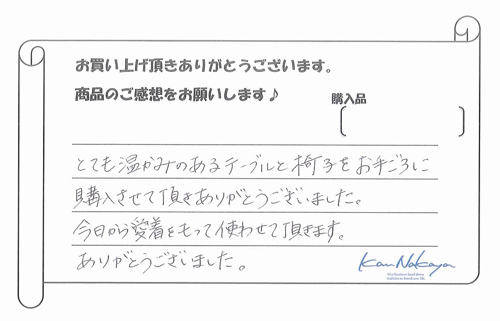 『とても温かみのあるテーブルと椅子をお手ごろに購入させて頂きありがとうございました。