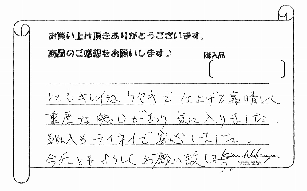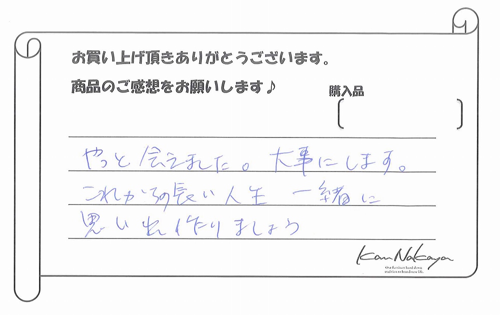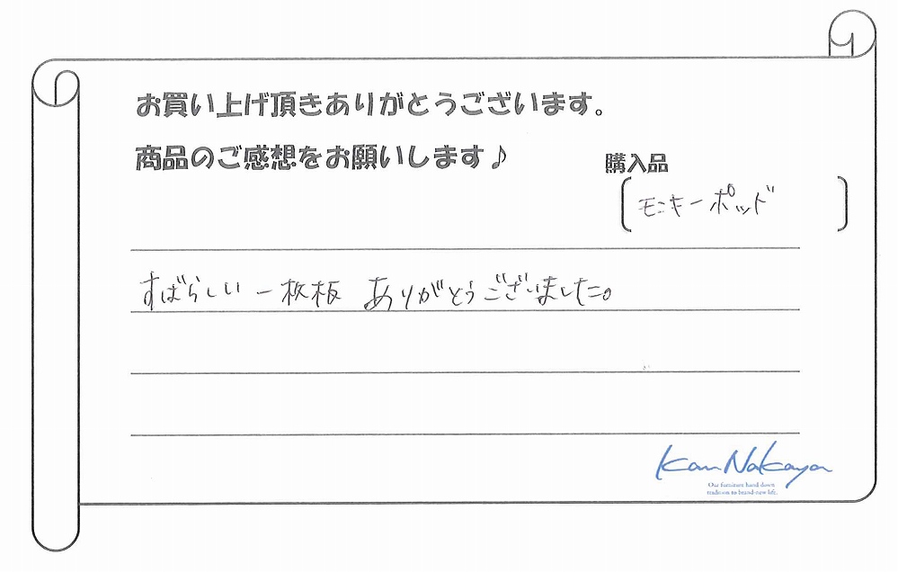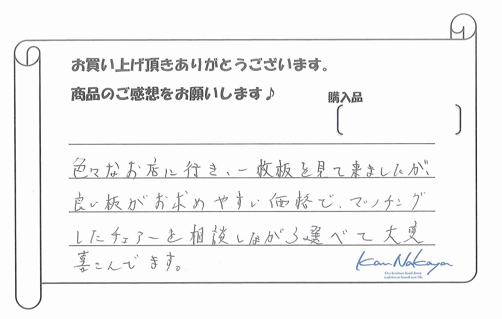 『色々なお店に行き、一枚板を見て来ましたが、良い板がお求めやすい価格で、マッチングしたチェアーを相談しながら選べて大変喜んでます。』