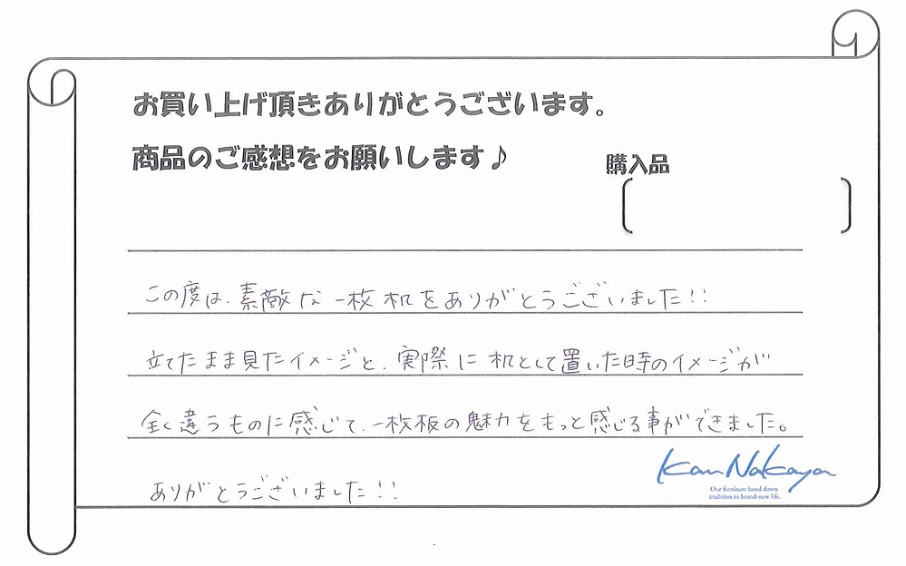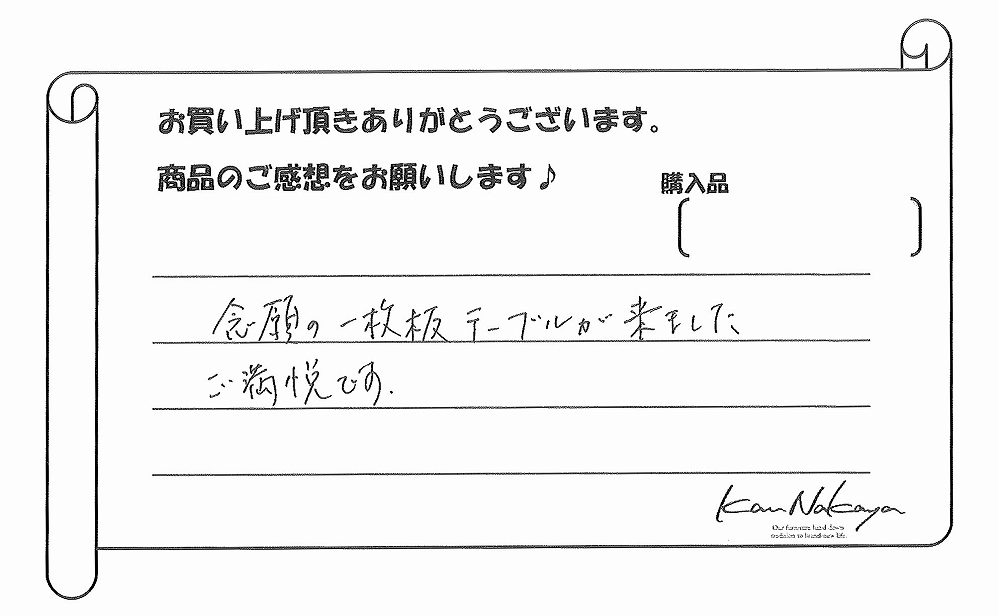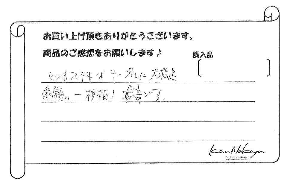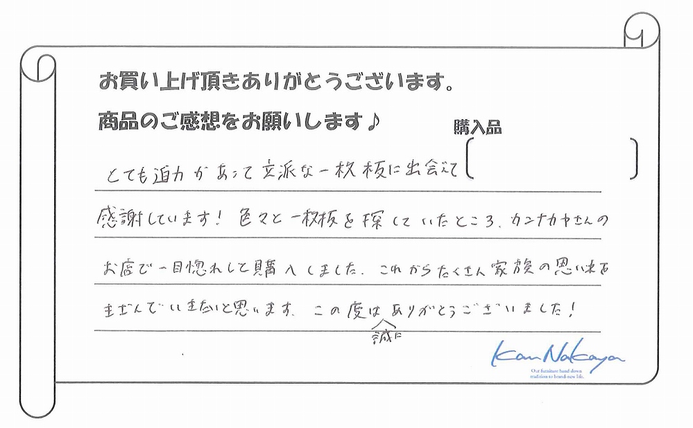 『とても迫力があって立派な一枚板に出会えて感謝しています!色々と一枚板を探していたところ、カンナカヤさんのお店で一目惚れをして購入しました。これからたくさん家族の思い出をきざんでいきたいと思います。この度は誠にありがとうございました!』