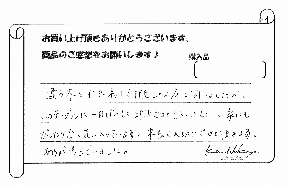 『違う木をインターネットで拝見してお店伺いましたが、このテーブルに一目ぼれして即決させてもらいました。