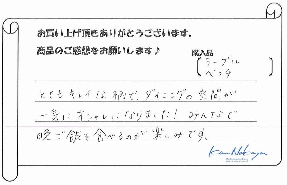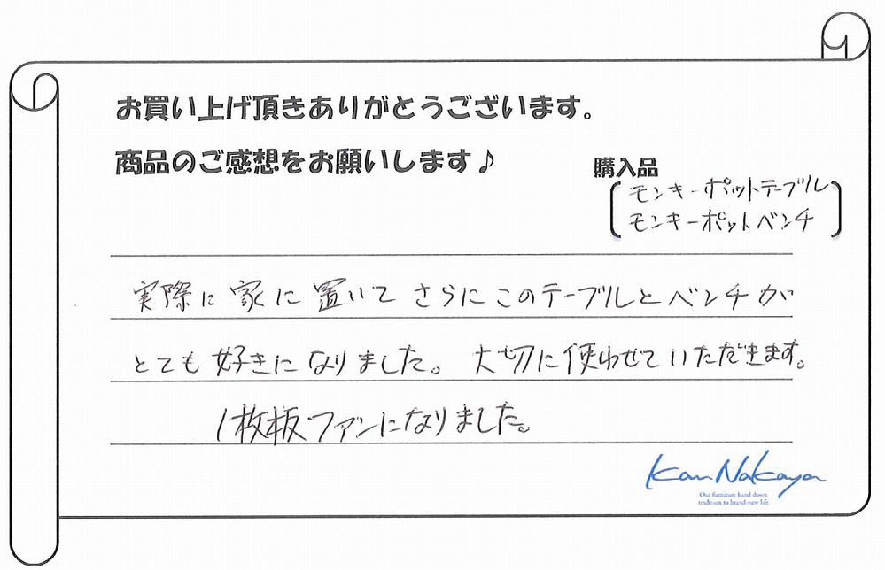 『実際に家に置いてさらにこのテーブルとベンチがとても好きになりました。大切に使わせて頂きます。