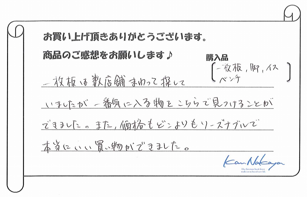 『一枚板は数店舗回って探していましたが一番気に入る物をこちらで見つけることができました。