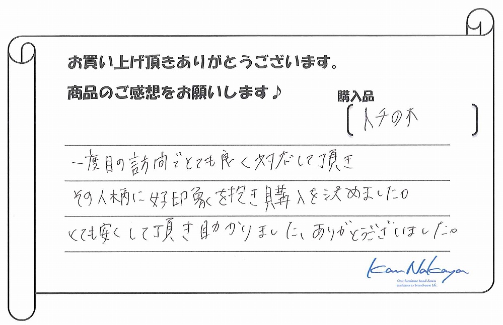 『一度目の訪問でとても良く対応して頂きその人柄に好印象を抱き購入を決めました。