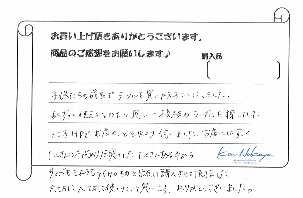 『子供たちの成長でテーブルを買いかえることにしました。長くずっと使えるものをとおもい一枚板のテーブルを探していたところHPでお店の事を知り伺いました。お店にはすごくたくさんの木があり圧巻でした。