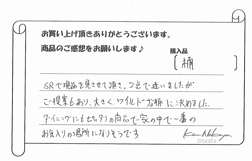 『SRで現品を見させて頂き、2点で迷いましたがご提案もあり、大きくワイルドな楠に決めました。
