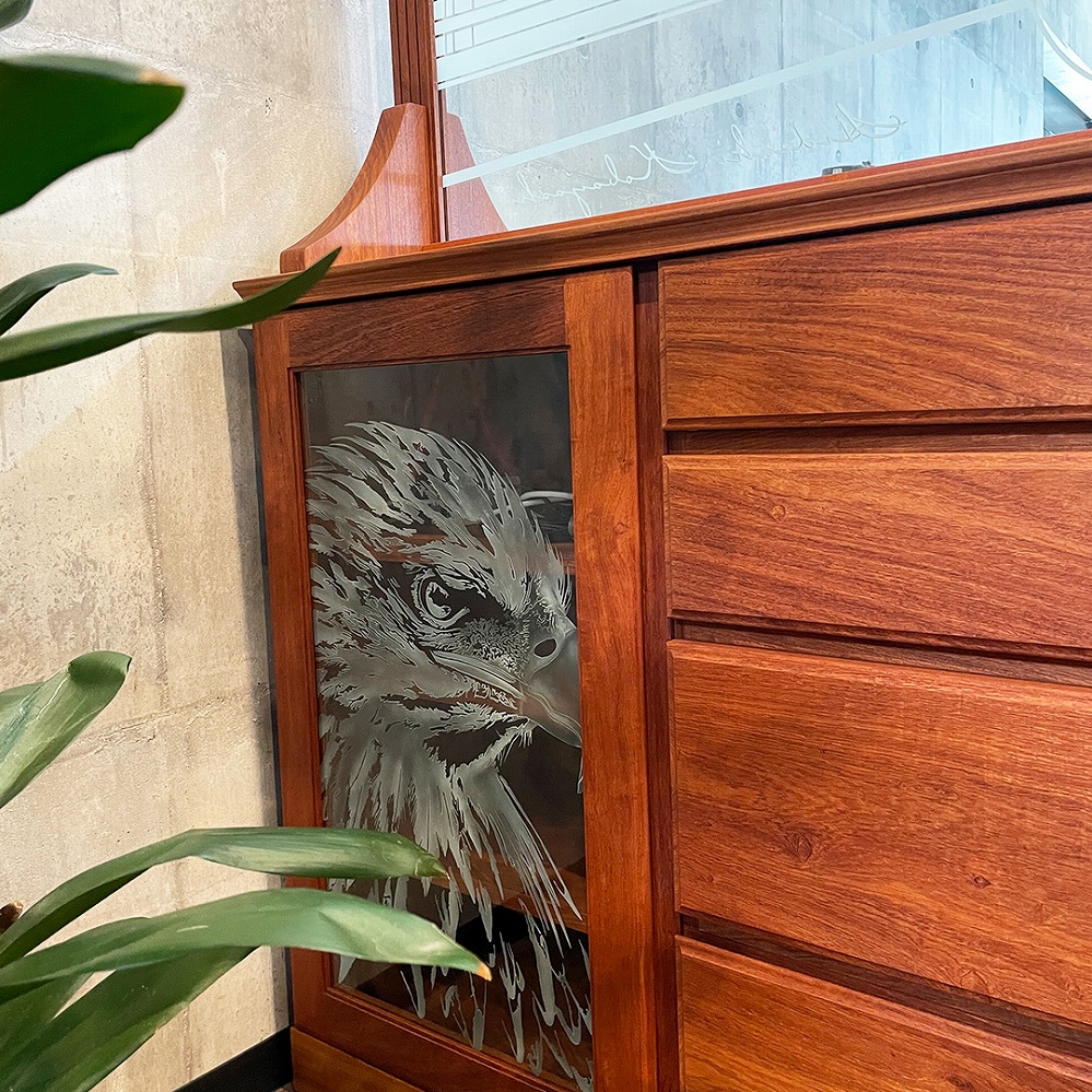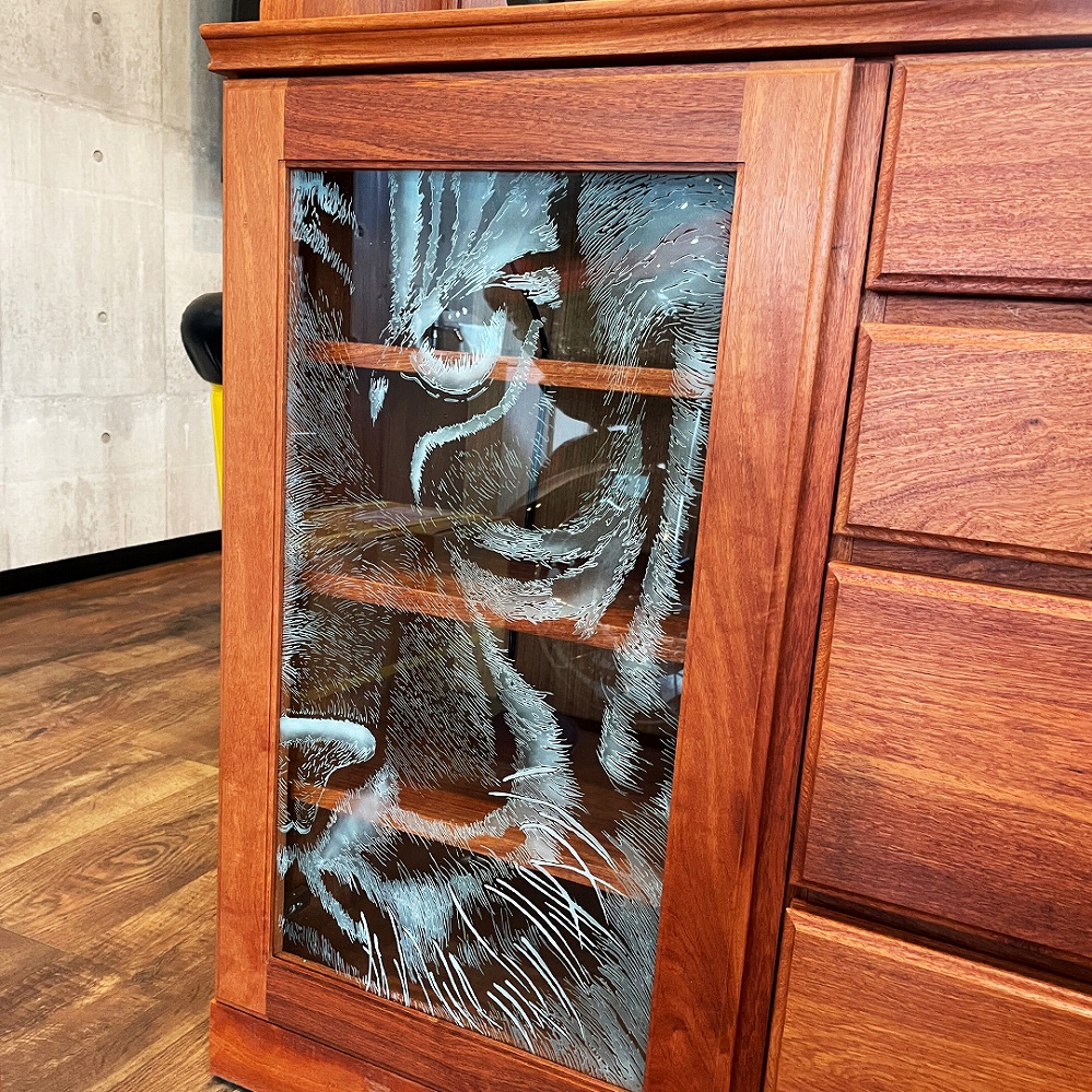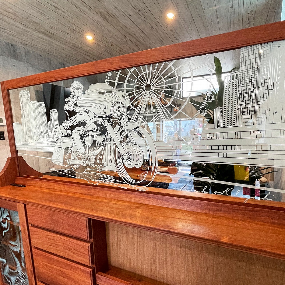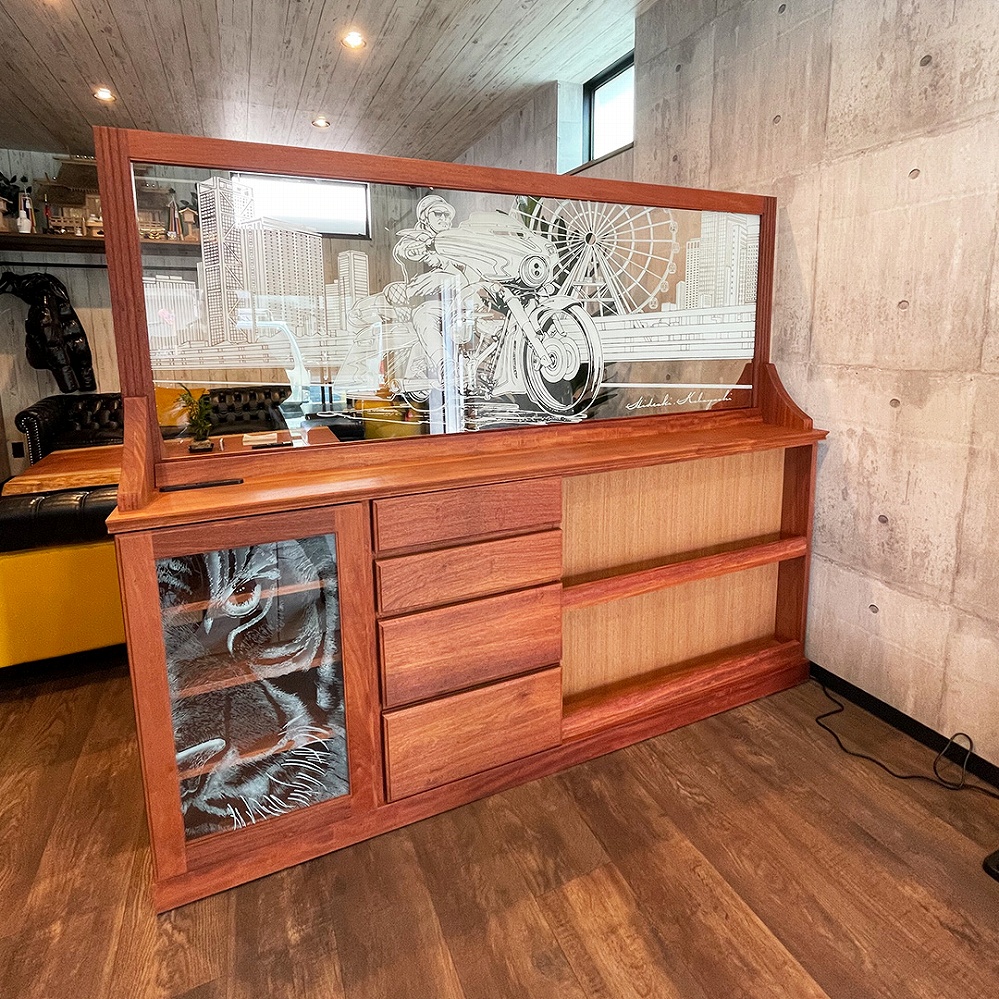 とてもかっこいいカウンターが仕上がりました。メインのエッジングガラスはご本人様です♪