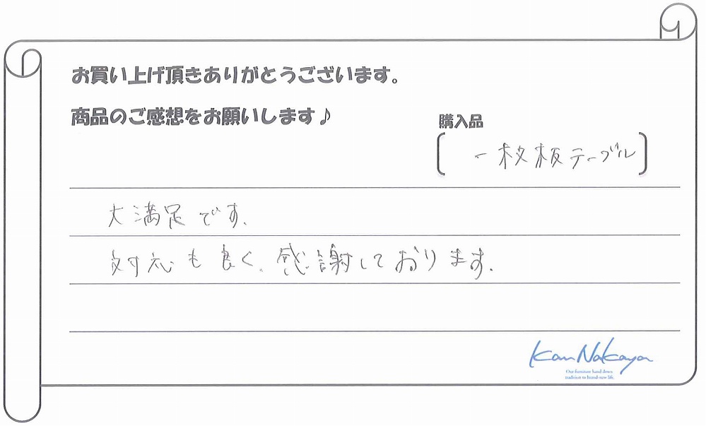 『店舗で見るよりも、自宅に納品された天板はより魅力的に見えました。お願いした側面のカットも期待以上で満足です。ありがとうございます。』